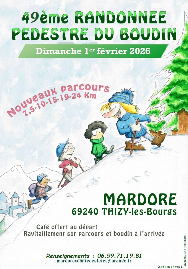 Départ Salle polyvalente de Mardore entre 7h30 et 14h. Ravitaillement sur les parcours, boudin et fromage à l'arrivée. Circuits avec nouveaux ravitaillements : 7,5 - 10 - 15 - 19 et 24 km. Café offert au départ et tombola gratuite.