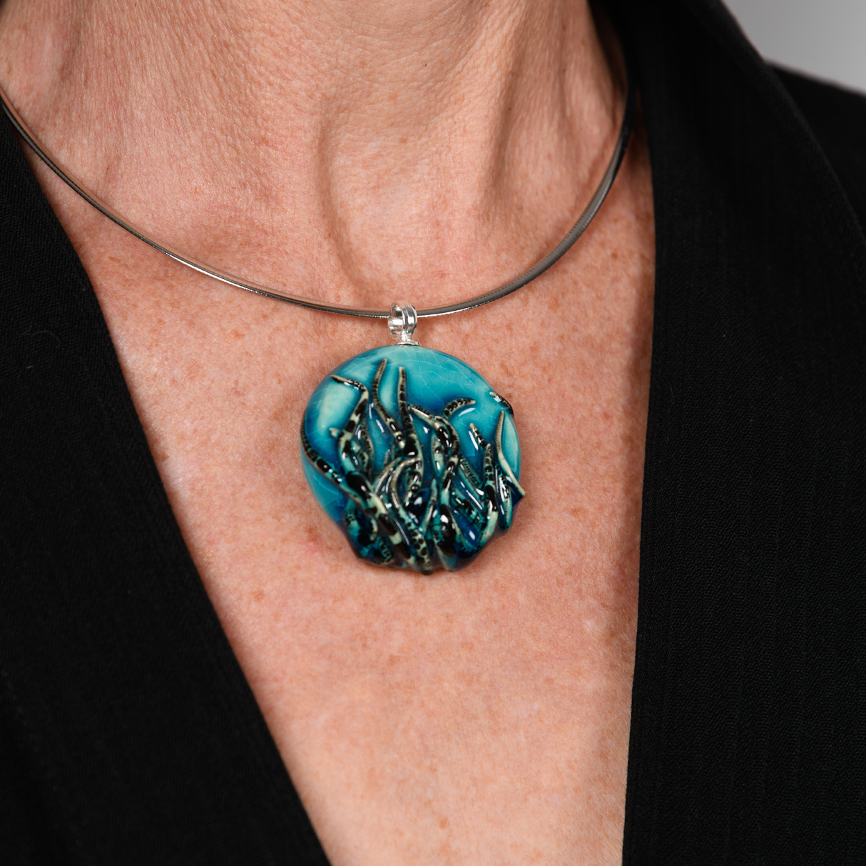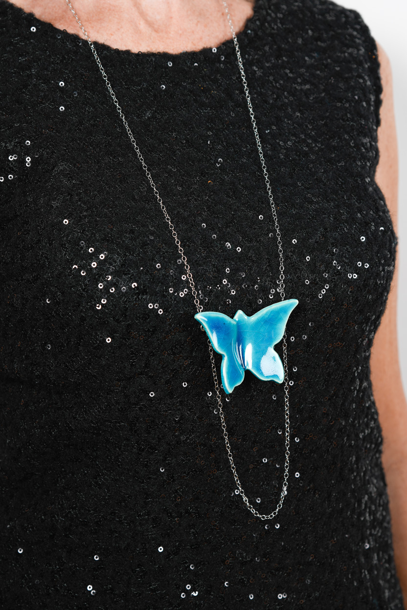 Dans son atelier elle créée et réalise des sculptures, de la décoration et des bijoux en céramique. Elle travaille "la terre" comme du tissu pour obtenir des drapés, des plissés, des effets de matières jusqu’à donner l'illusion parfaite.