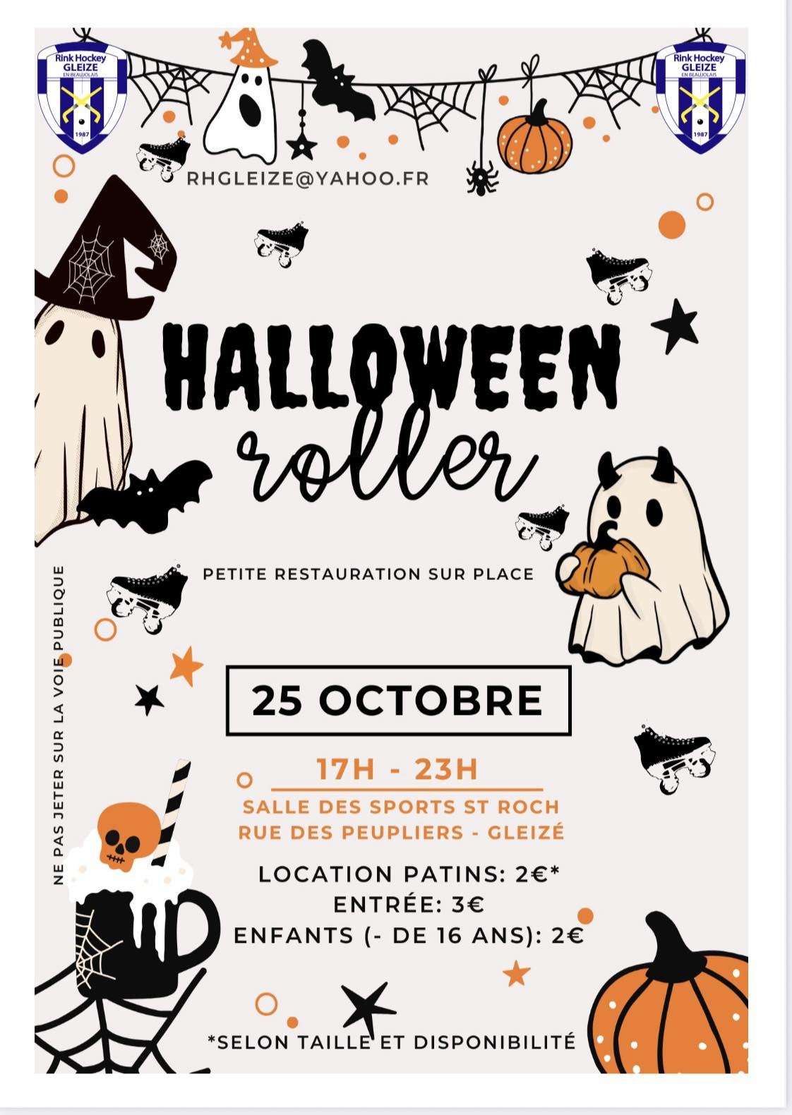 Le Rink Hockey de Gleizé organise sa soirée "Roller HALLOWEEN" le samedi 25 octobre de 17h à 23h à la salle des sports Saint-Roch de Gleizé. Une soirée fun déguisée ou non avec le Rink Hockey de Gleizé. Petite restauration sur place. Soirée ouverte à tous.