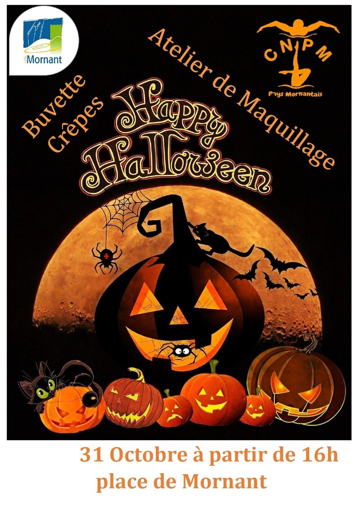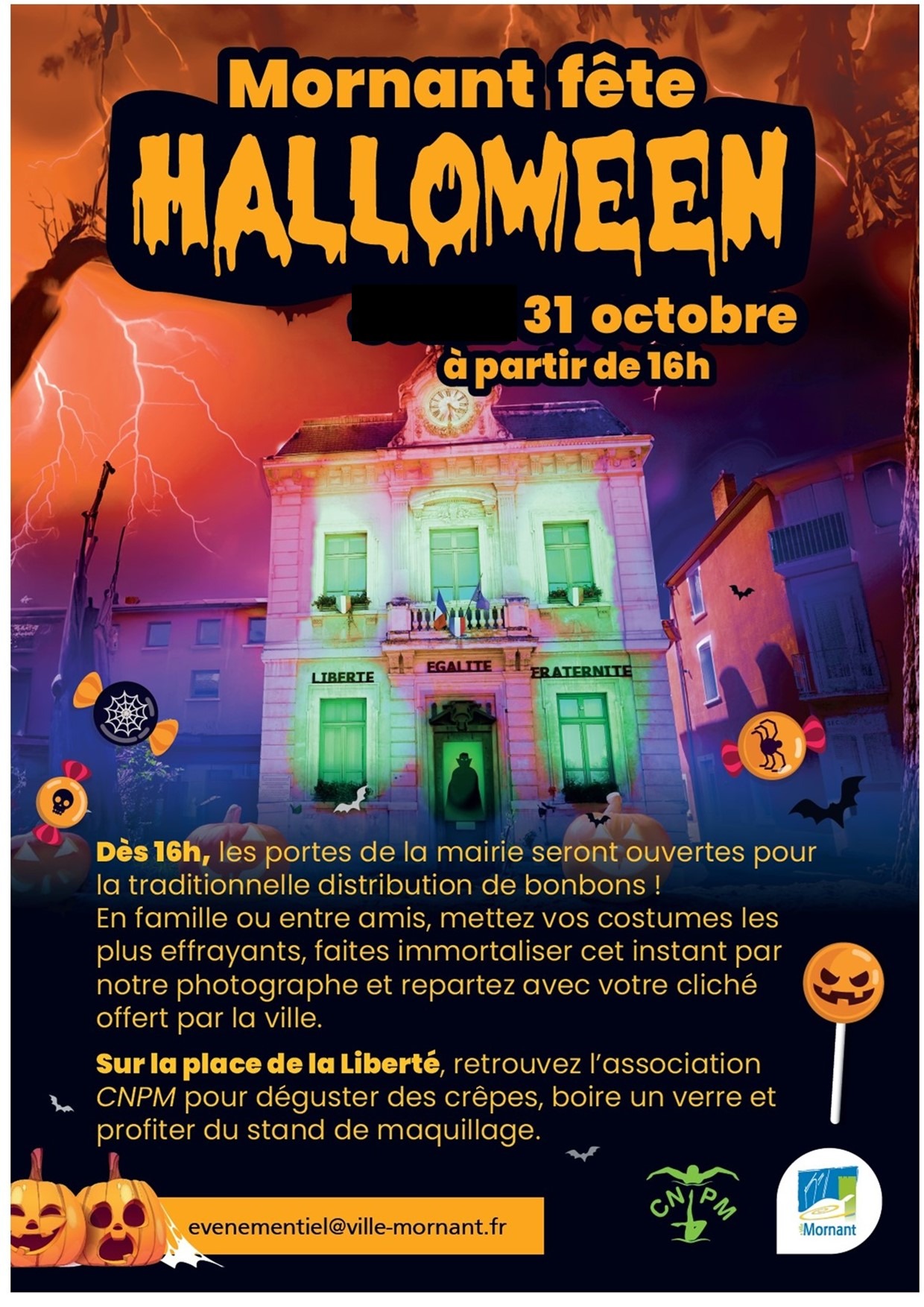 Dès 16 h les portes de la mairie s'ouvrent : la traditionnelle distribution de bonbons. Mettez vos costumes et faites immortaliser cet instant par notre photographe ! Place de la Liberté, retrouvez l'association CNPM, atelier maquillage, buvette et crêpes