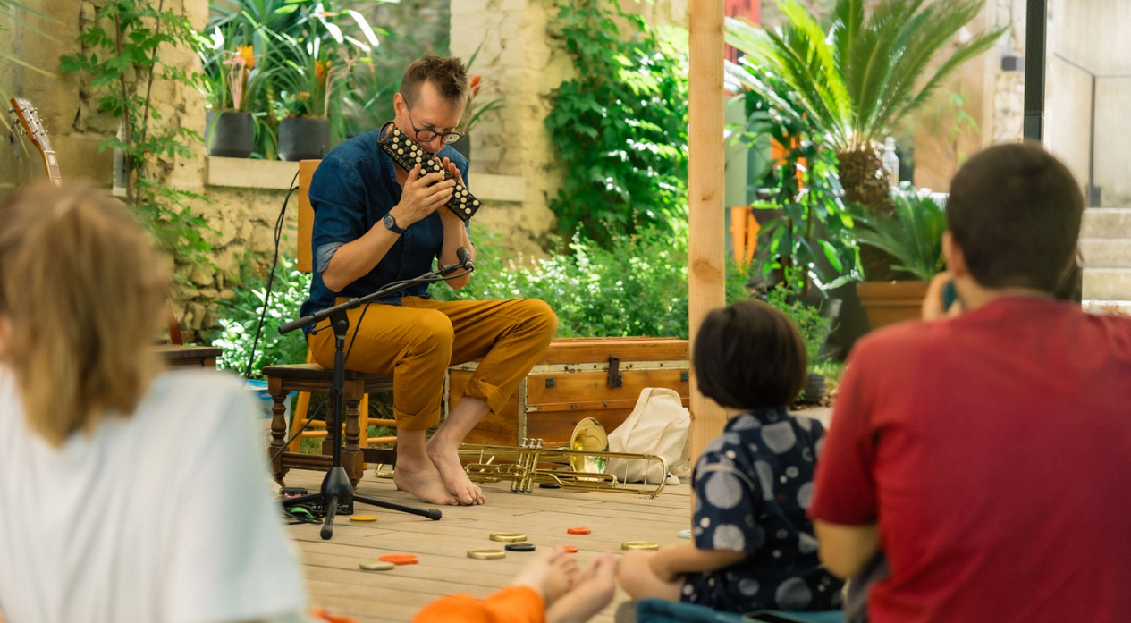 De Balbutiements en Babillages, nos deux personnages se découvrent, échangent, s’apprivoisent, improvisent et s’emBarquent dans un Ballet de Balles sonores. De Bamako à Bali en passant par Bannalec ou les Balkans, sans s’interdire de nombreux Bazars sonores imaginés, Chloé et Ronan Badinent avec les sons, Balancent des rythmes sans Baguette, Barbouillent des improvisations et délivrent un monde sonore Bariolé. Ils emBarquent le jeune public dans un grand Bal d’émotions emBallant, laissant les Bambins tout BaBa…