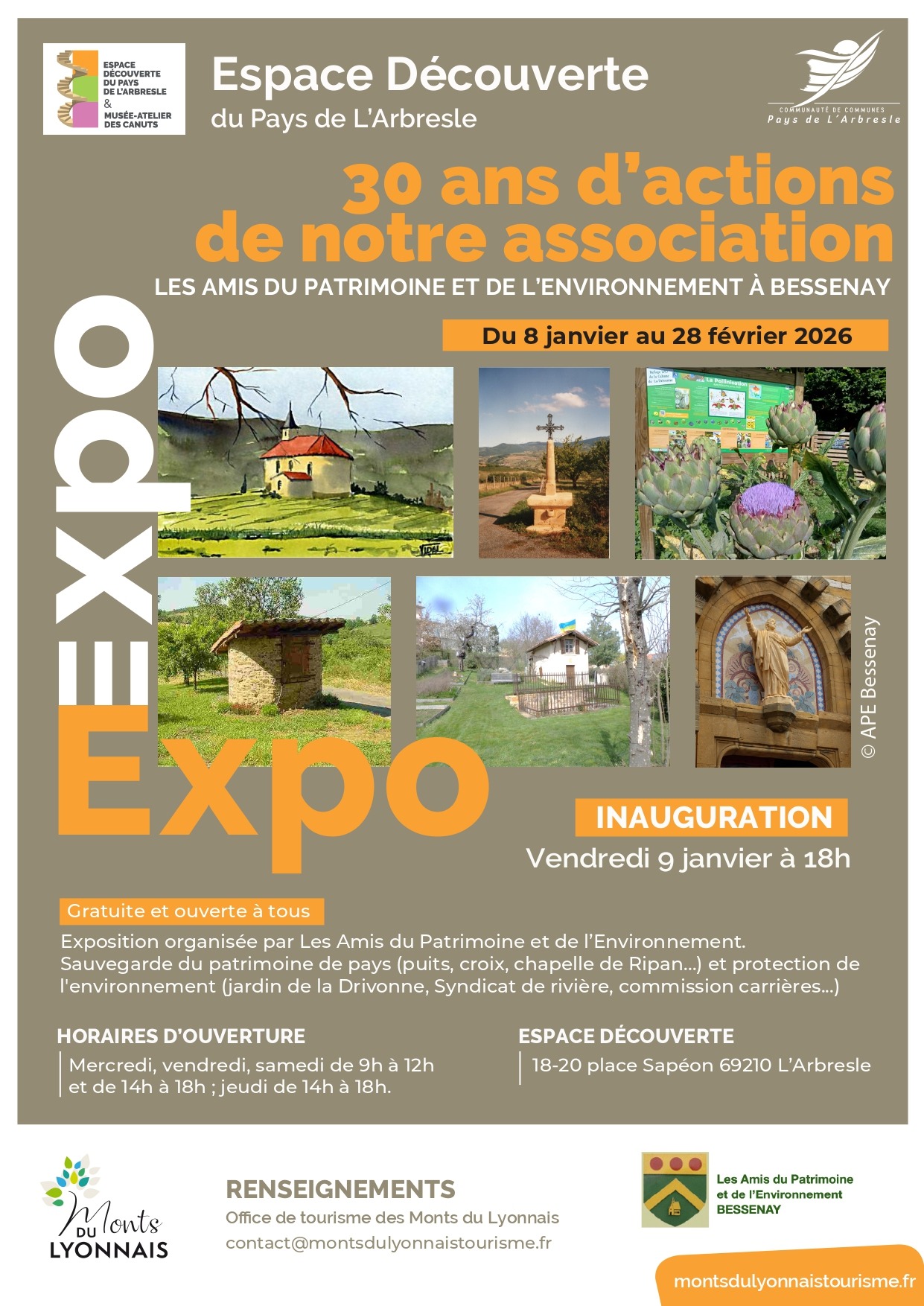L'exposition présente les activités de sauvegarde du patrimoine de pays (puits, croix, chapelle de Ripan...) et de protection de l'environnement (jardin de la Drivonne, rivières, carrières…) des Amis du Patrimoine et de l’Environnement de Bessenay.