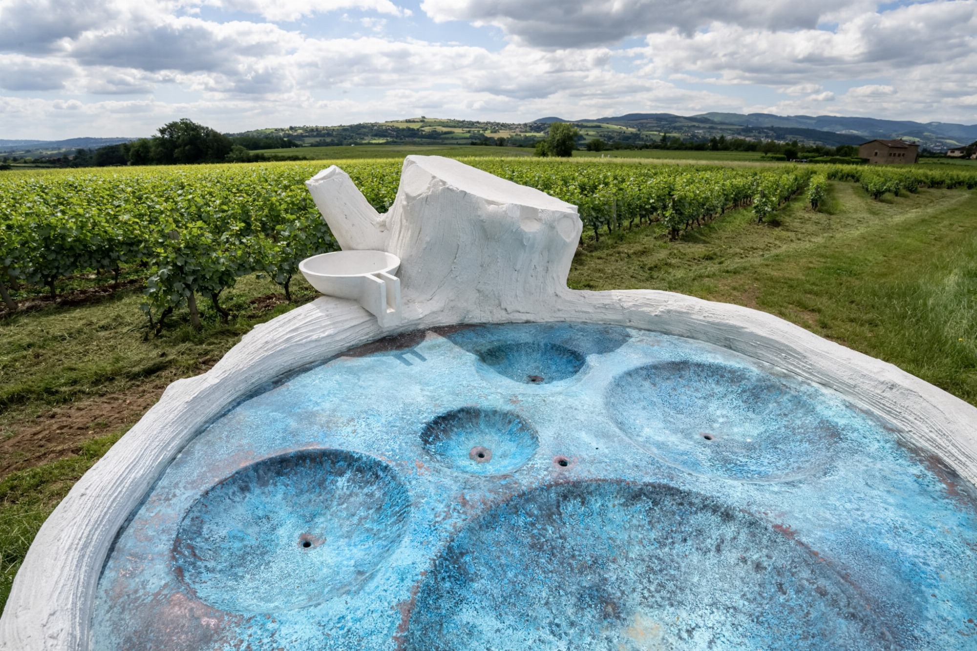 L’œuvre mettra en scène les interactions du vivant au cœur de l’activité viticole, en articulant l’art et la science. Pensée comme une ode au travail de la vigne, la sculpture se construira dans le temps. La partie supérieure, en partie cuivrée, servira de réceptacle pour les eaux de pluie, mais aussi pour recueillir des offrandes de vin. Ces liquides orientés se chargeront en sels de cuivre, sculptant et colorant progressivement la pierre. Le Duo Evernia explore les effets de l’activité humaine sur l’environnement et propose de porter attention à la préservation des sols.