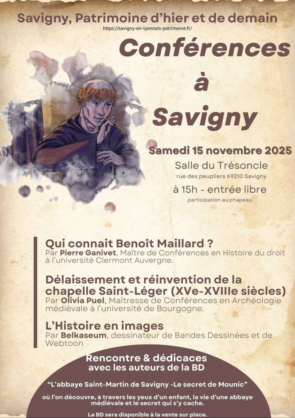 A l'occasion de la sortie de la bande dessinée "L'Abbaye Saint-Martin de Savigny - Le secret de Mounic" , une après-midi rencontre avec les auteurs est organisée autour du sujet par l'association Savigny Patrimoine d'hier et de demain.