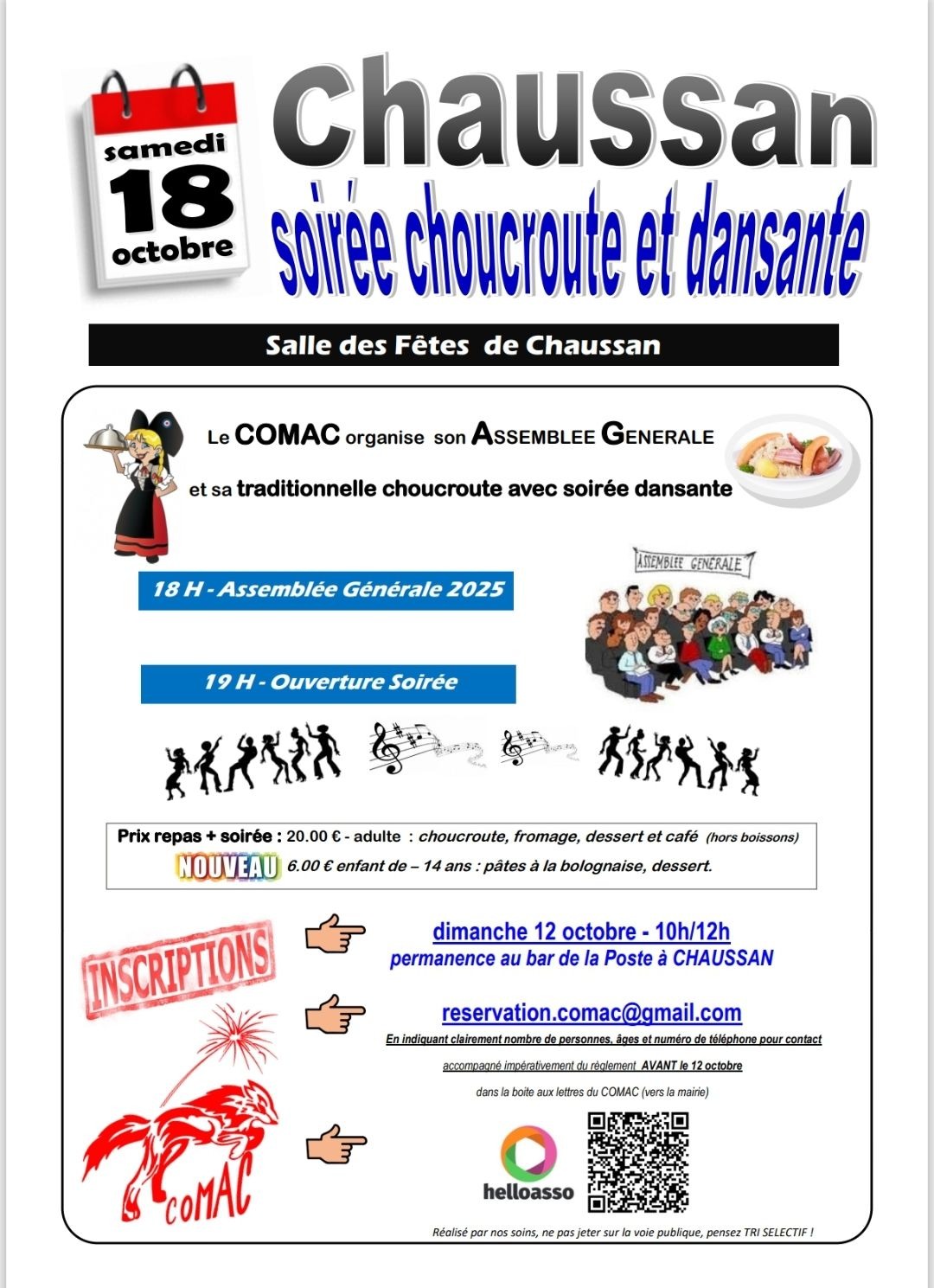 RESERVATION par mail : reservation. comac@gmail.com : indiquer nombre de personnes, âges et N° de tél pour contact. Réglement avant le 12 octobre.