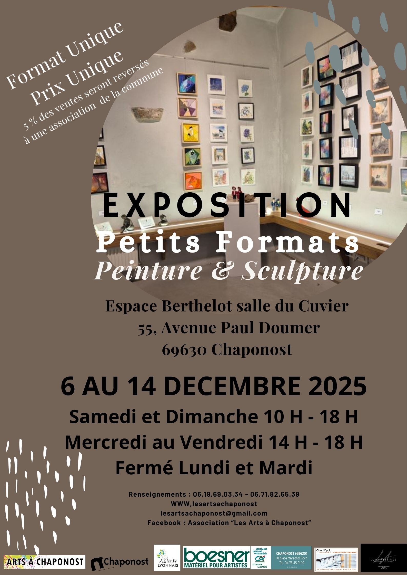 Les Arts à Chaponost organisent une exposition de petits formats peintures et sculptures, prix unique 90 € dont une partie sera reversée à une association de Chaponost.