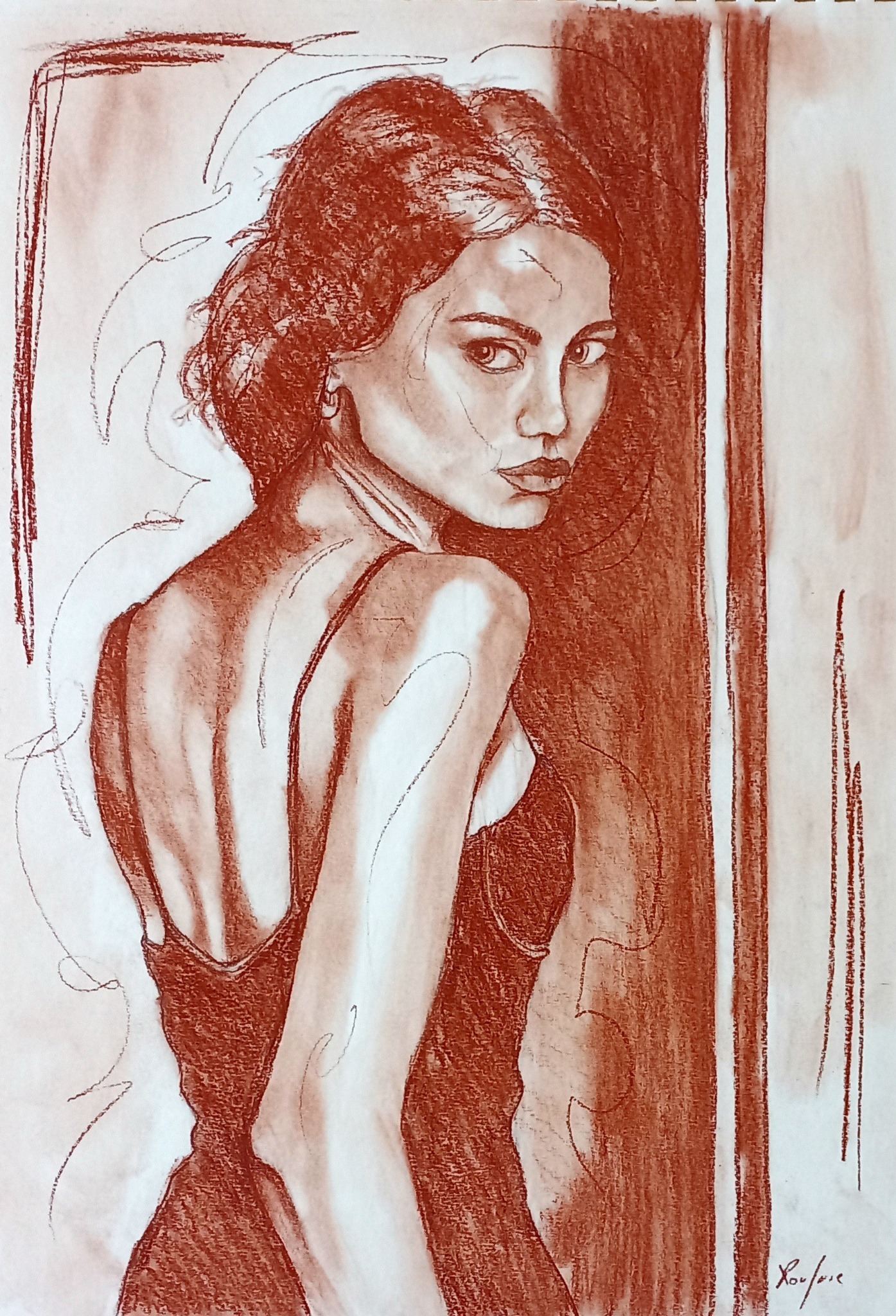 Valérie Rouquié expose ses œuvres, essentiellement des dessins à la pierre noire, sépia et sanguine dans un style épuré.