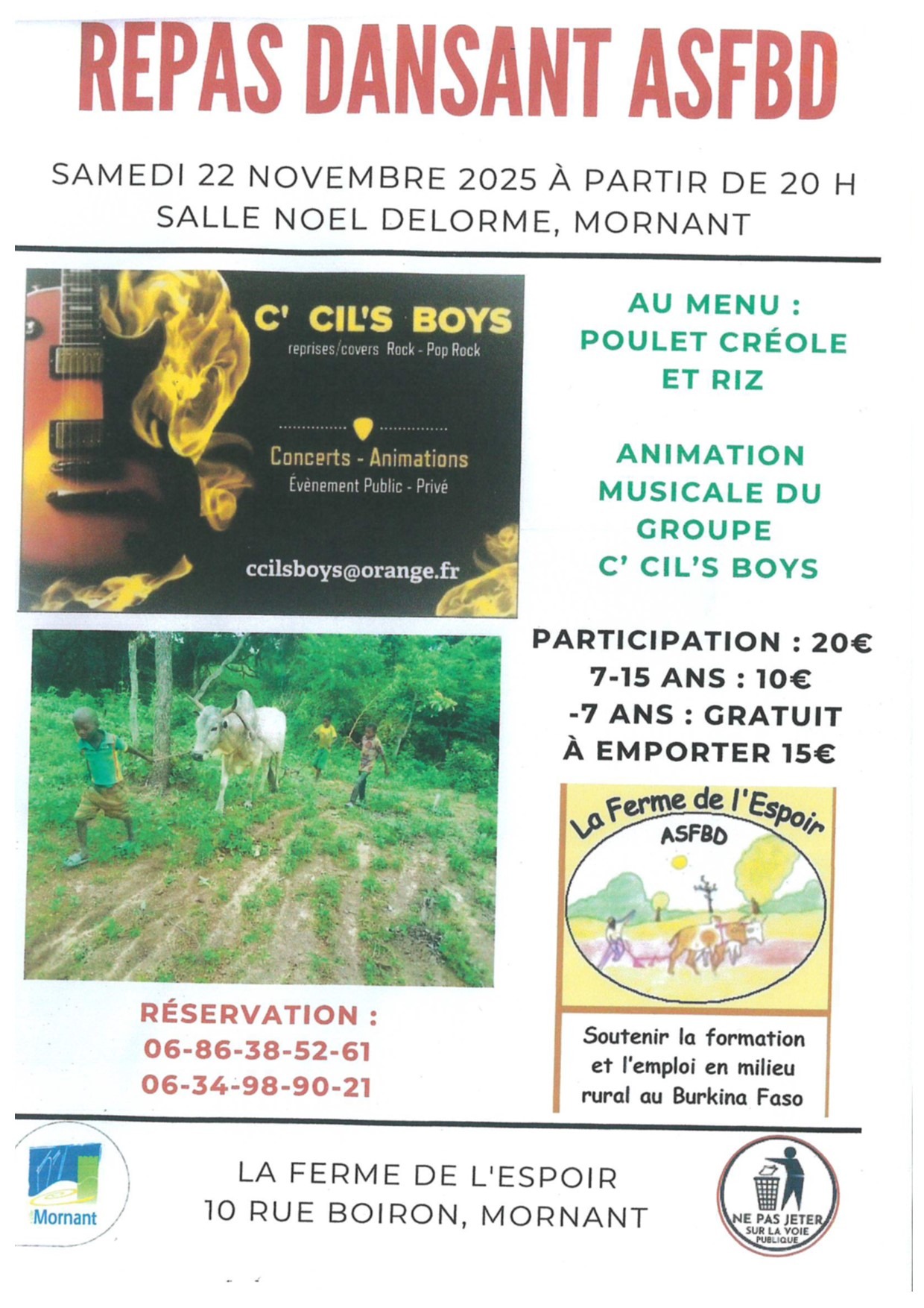 L'association"ASFBD Ferme de l'Espoir" organise son repas-dansant annuel. Animation musicale avec le groupe "C'CIL'S BOYS" reprises & covers rock-pop rock.