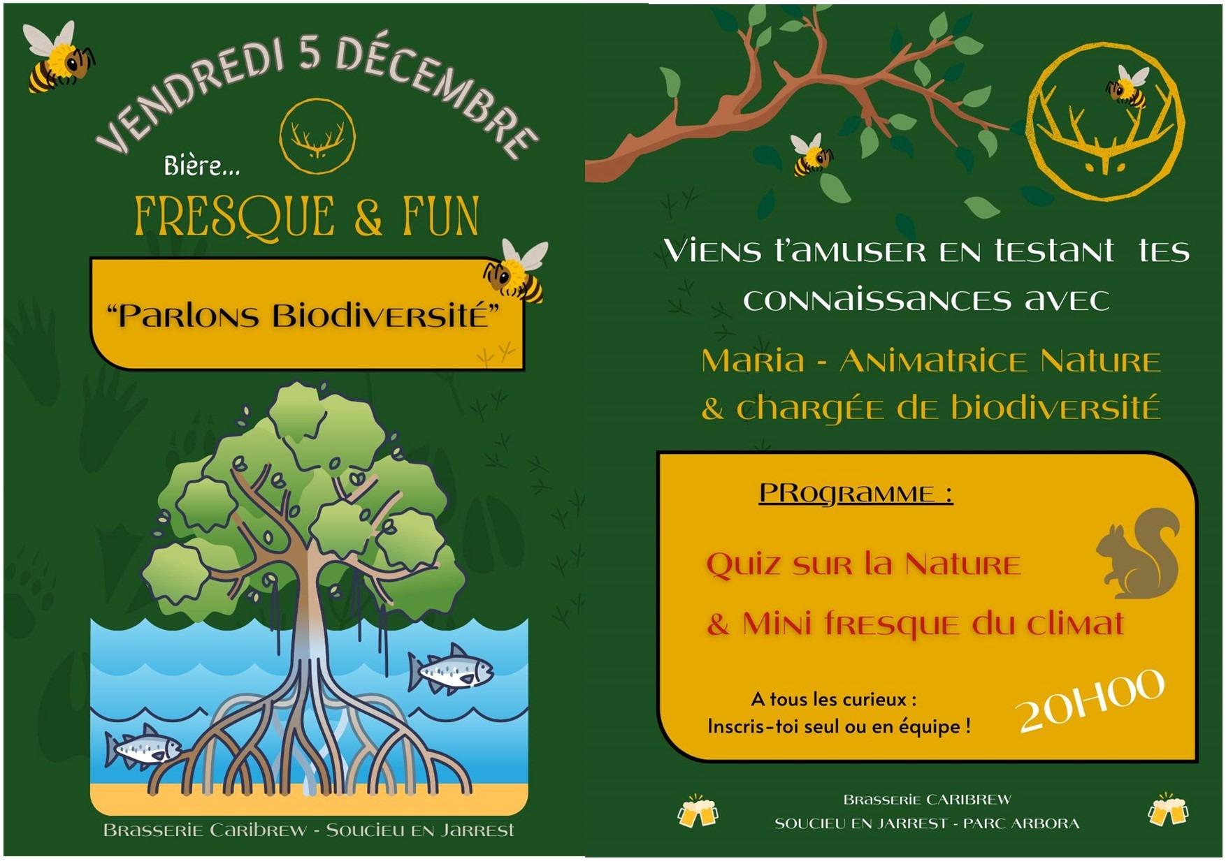 La brasserie Caribrew propose une soirée quiz sur la Nature et une mini-fresque du climat. Viens t'amuser en testant tes connaissances avec Maria, animatrice nature et chargée de biodiversité. Inscris-toi seul ou en équipe !