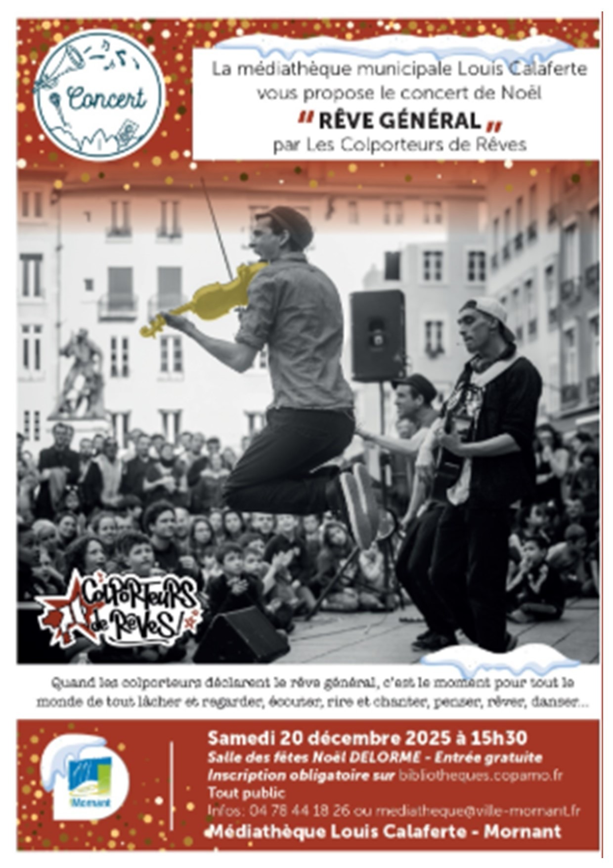 La médiathèque municipale Louis Calaferte vous propose le concert de Noël "Rêve Général" par la Cie Les Colporteurs de Rêves.