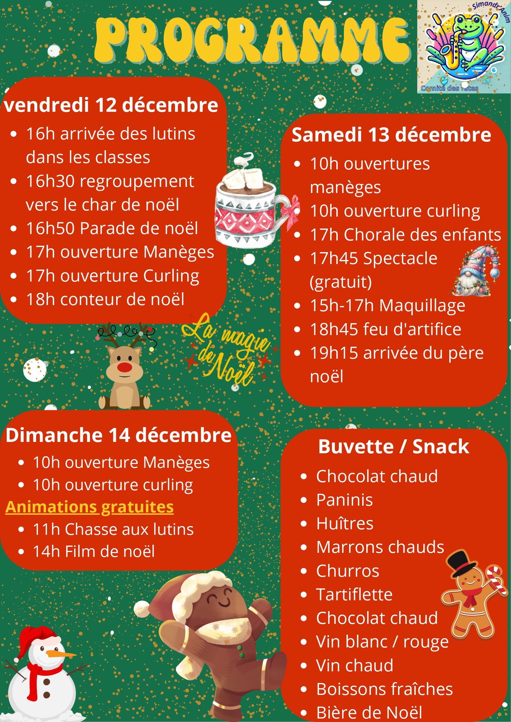 Samedi 10h00 ouverture des manèges, chorale des enfants, spectacle, feu d'artifie, arrivée du père Noël