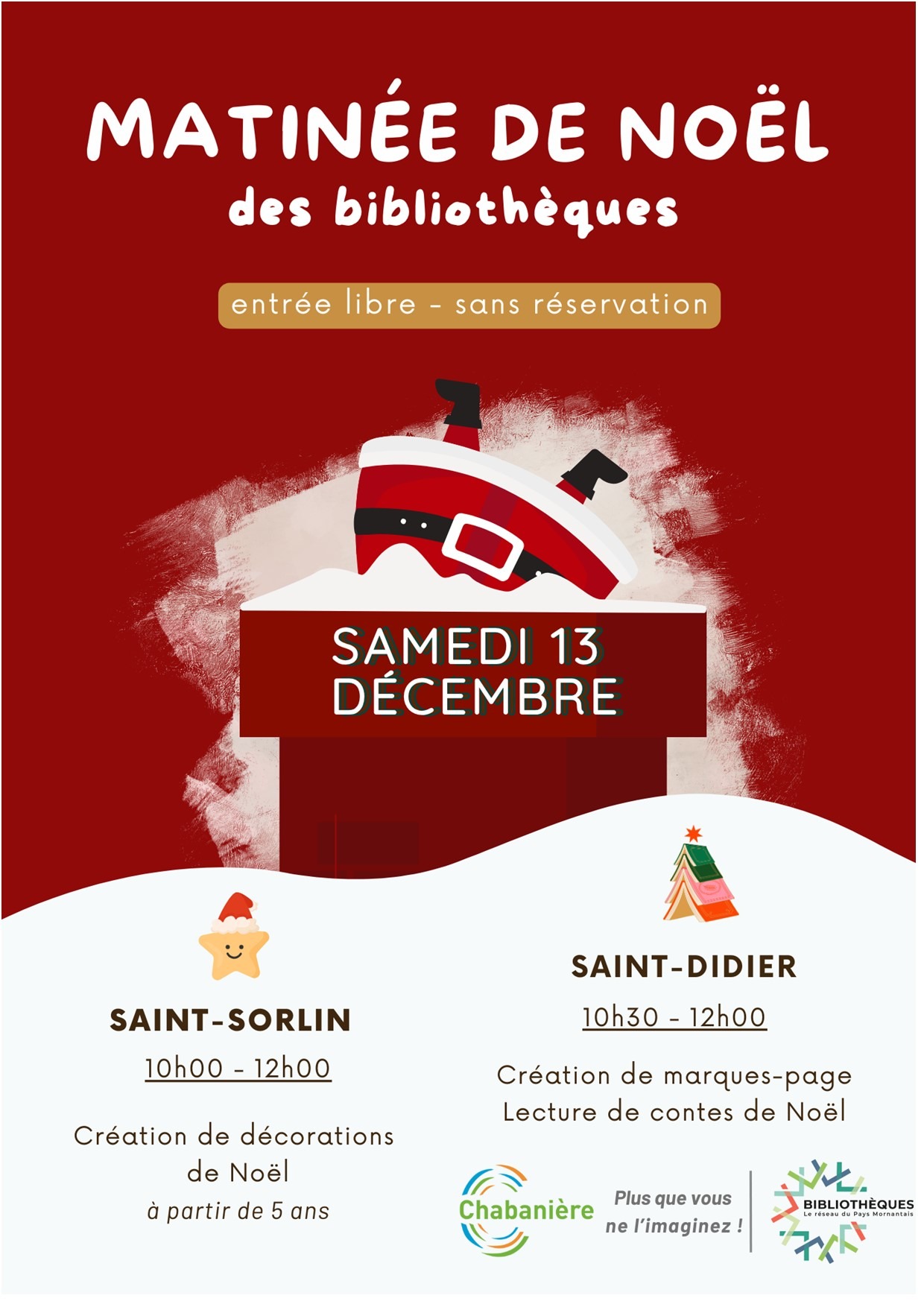 Les bibliothèques de Saint Sorlin et de Saint Didier sous Riverie vous proposent des ateliers pour préparer Noël et se mettre dans l'ambiance des festivités de fin d'année.