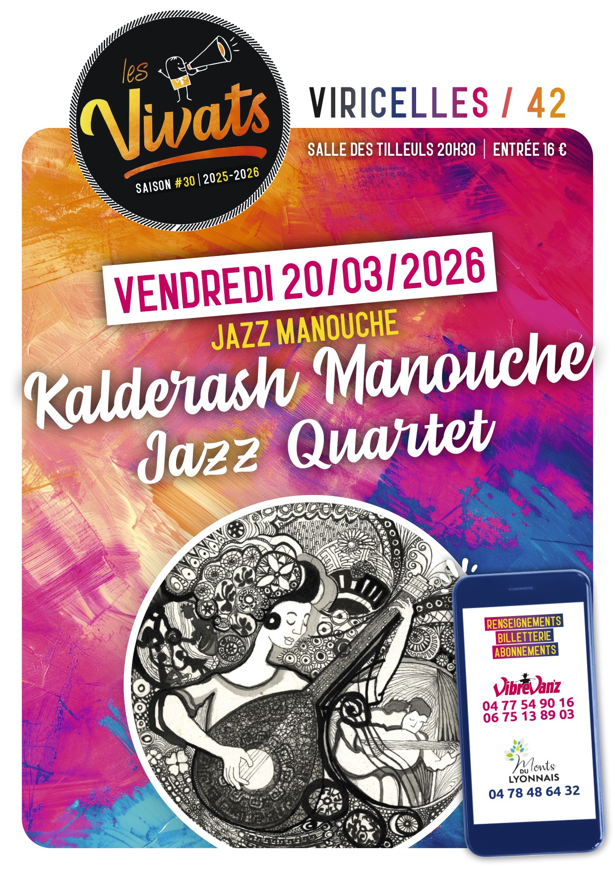 Du Jazz Manouche à l'affiche des Vivats ! Avec le groupe : Kalderash Manouche Jazz Quartet. Quatre musiciens sur scène. Répertoire swing manouche incorporant des musiques de l'Est, et de la musique latino-américaine.