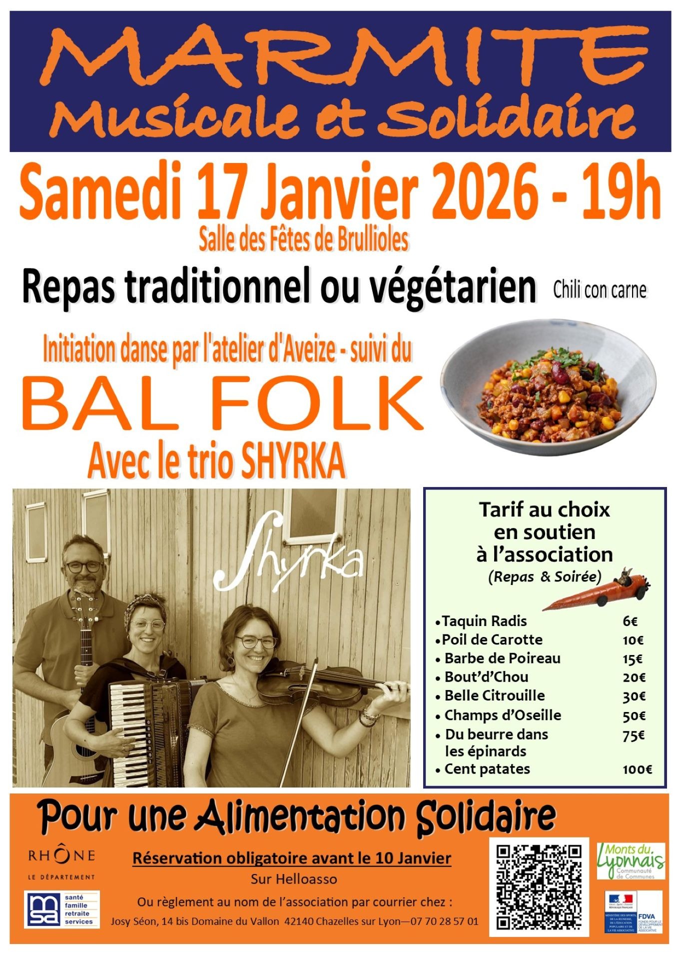 Vous profiterez d'un bon repas de qualité, préparé avec amour par nos bénévoles passionné·es puis venez enflammer la piste de danse sur des rythmes folks avec le groupe Shyrka!