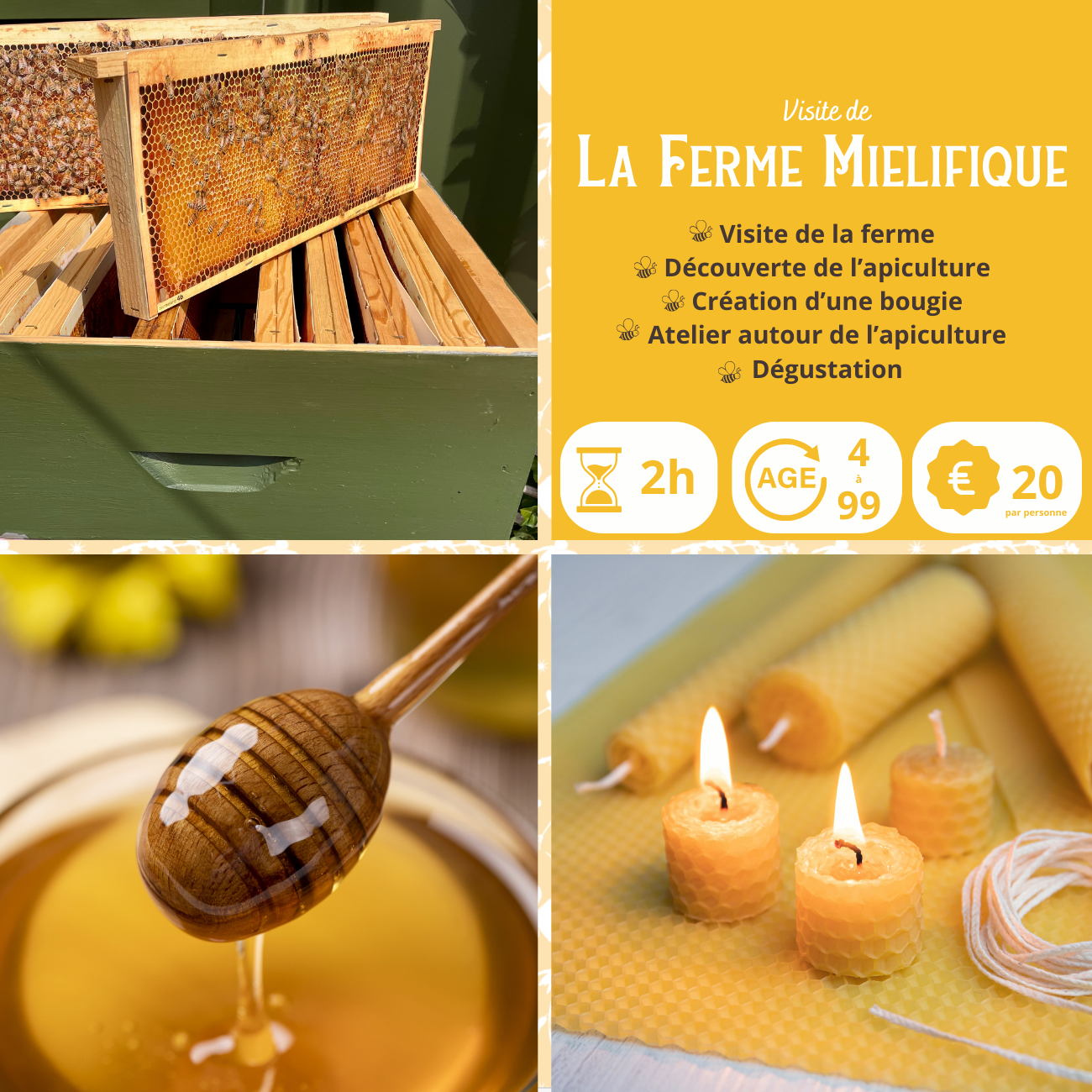 Pour les familles de 4 personnes et plus (inscrites le même jour) : demandez un code remise de 10% par mail : estelle@lafermemielifique.fr.