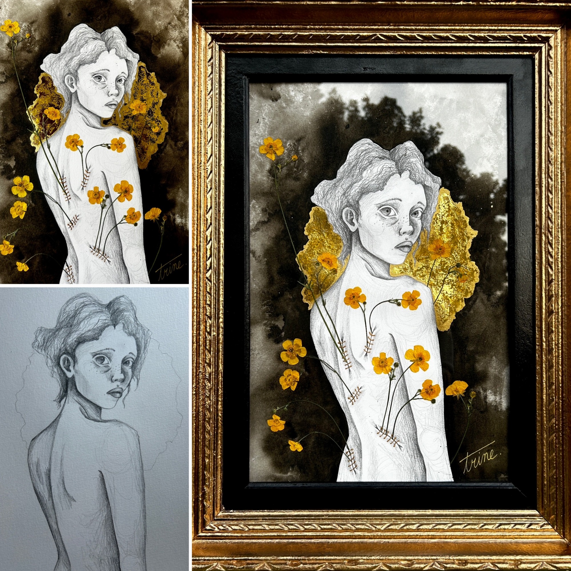 Trine marie différente techniques picturales telles que l’encre l’aquarelle, l’acrylique ou le crayon, afin de créer principalement des portraits féminins traversés par le murmure des émotions profondes : la mélancolie, la fragilité, la mutation, la résistance silencieuse. Son travail puise dans ses expériences intimes, dans les oscillations de son vécu et dans cette bataille intérieure qui façonne autant l’être que l’œuvre.
