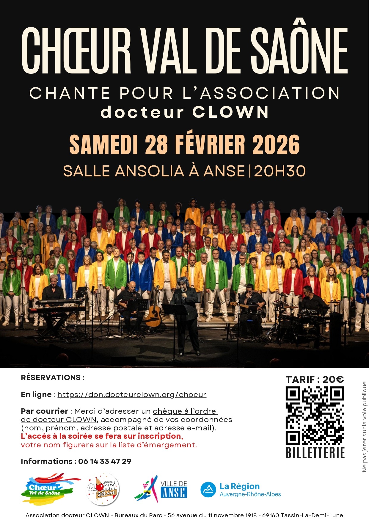A l'occasion des 20 ans de l'antenne Docteur Clown Villefranche-Beaujolais, un spectacle exceptionnel est donnée par les musiciens et les 180 choristes du Chœur Val de Saône.