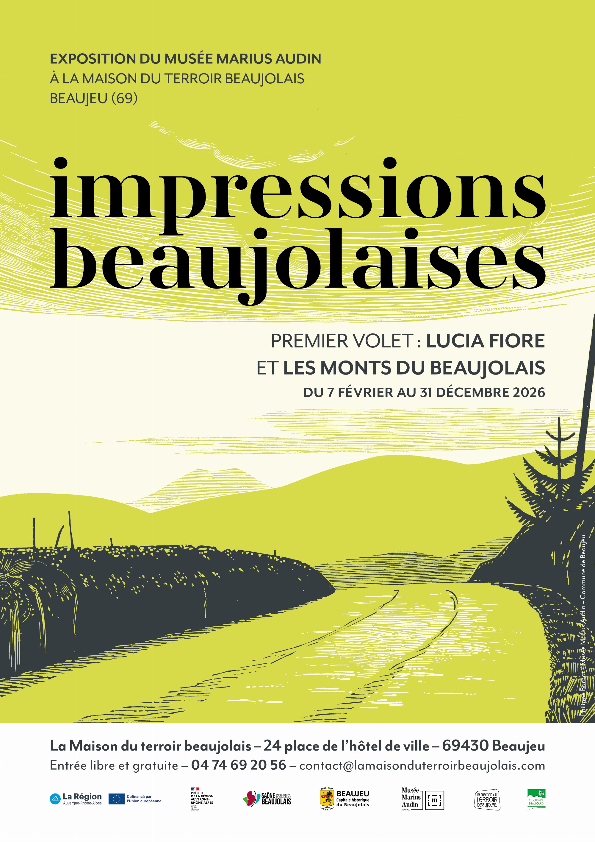 L’exposition « Impressions beaujolaises » est une production du Musée Marius Audin, établissement reconnu Musée de France et propriété de la commune de Beaujeu. Elle bénéficie du cofinancement de l’Union européenne dans le cadre du programme LEADER et du soutien de la Direction régionale des affaires culturelles Auvergne-Rhône-Alpes. La programmation culturelle est réalisée et cofinancée avec la Maison du terroir beaujolais, régie par la Communauté de Communes Saône-Beaujolais.