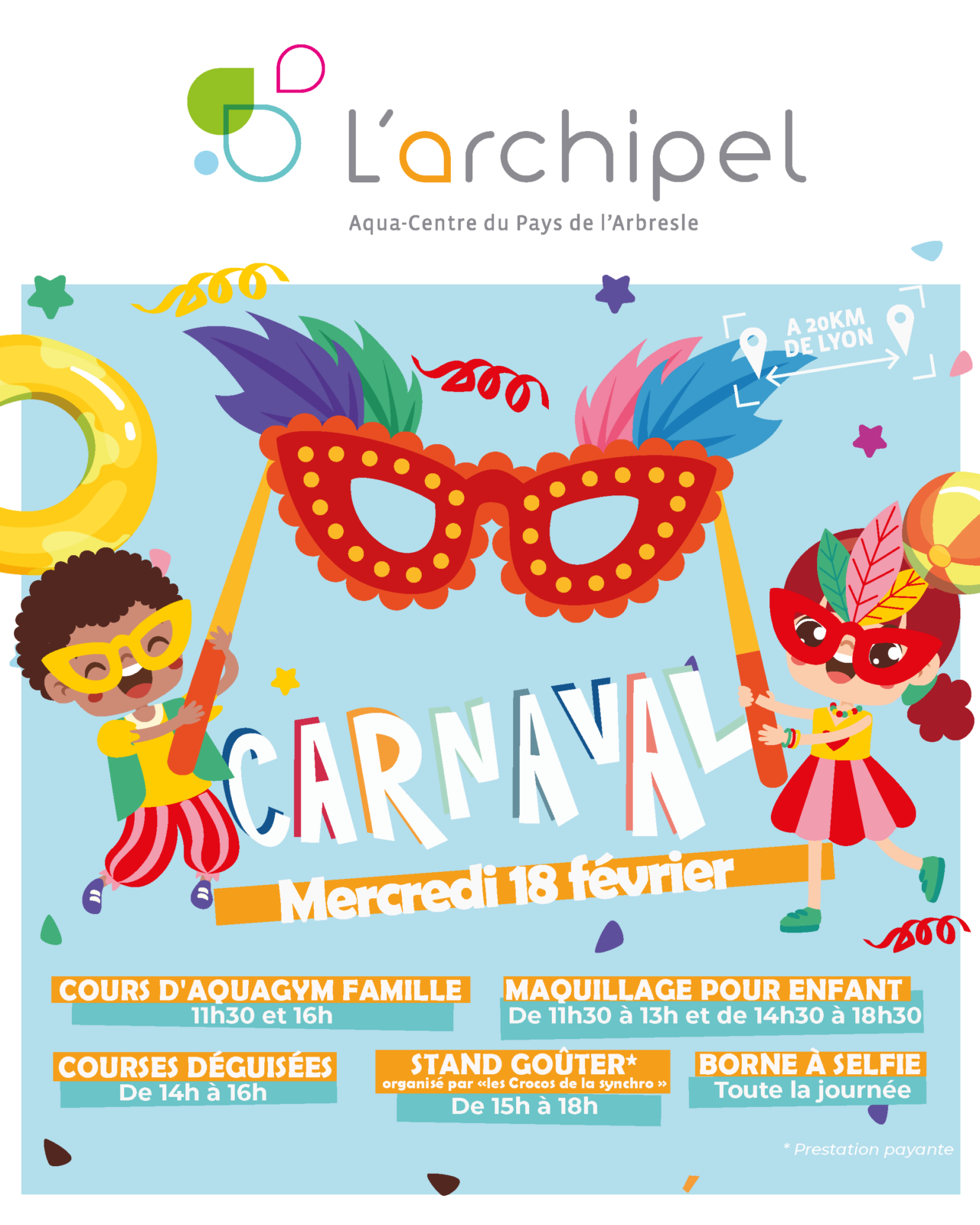 Animations, maquillage pour enfants, courses déguisées, aquagym en famille et borne à selfie sont au programme ! Un stand goûter sera également proposé par l’association « les crocos de la synchro ».