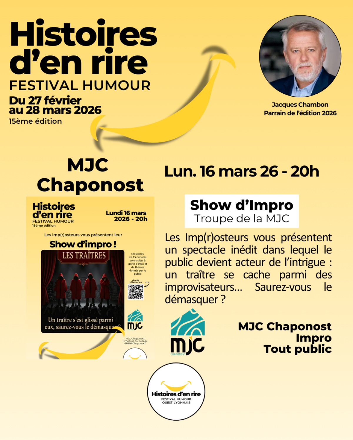 Les Imp(r)osteurs vous présentent un spectacle inédit dans lequel le public devient acteur de l'intrigue : un traître se cache parmi des improvisateurs. Saurez-vous le démasquer ?