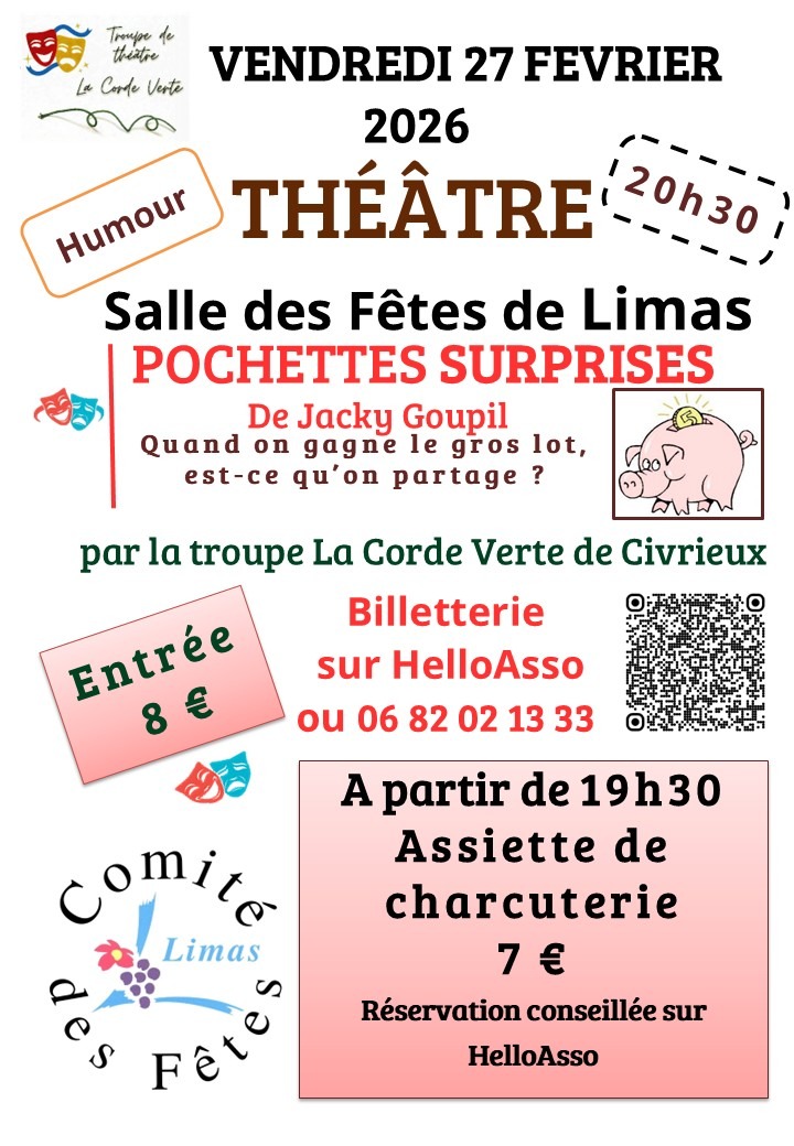 A partir de 19h30 Assiette de charcuterie 7€ - 20H30 Théâtre "Pochettes Surprises" de Jacky Goupil par la troupe La Corde Verte de 01 -Civrieux