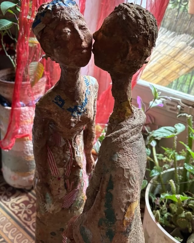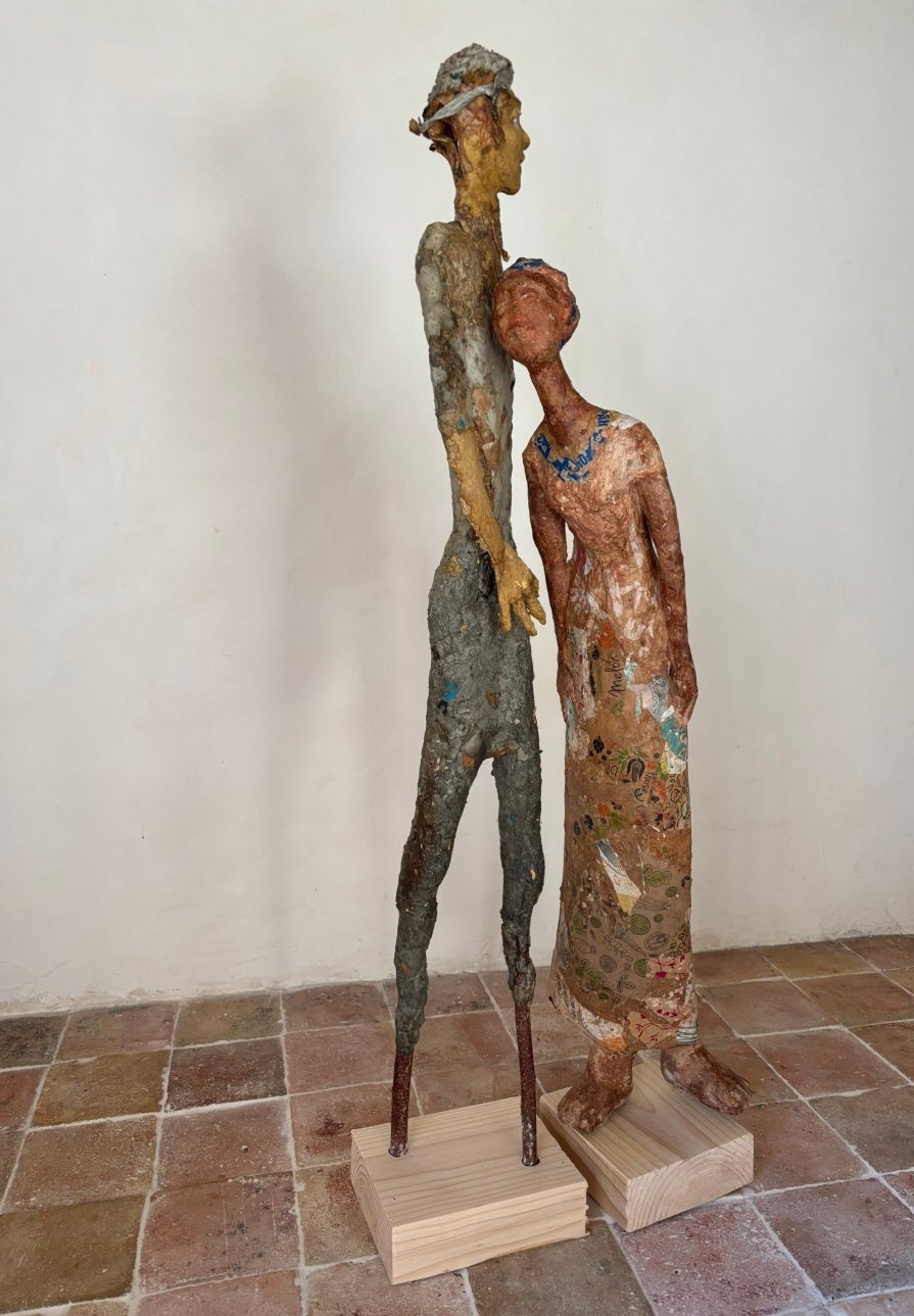 Les sculptures, réalisées en pâte à papier mêlée à divers matériaux, évoluent au séchage et au ponçage, dans une démarche instinctive et expérimentale.