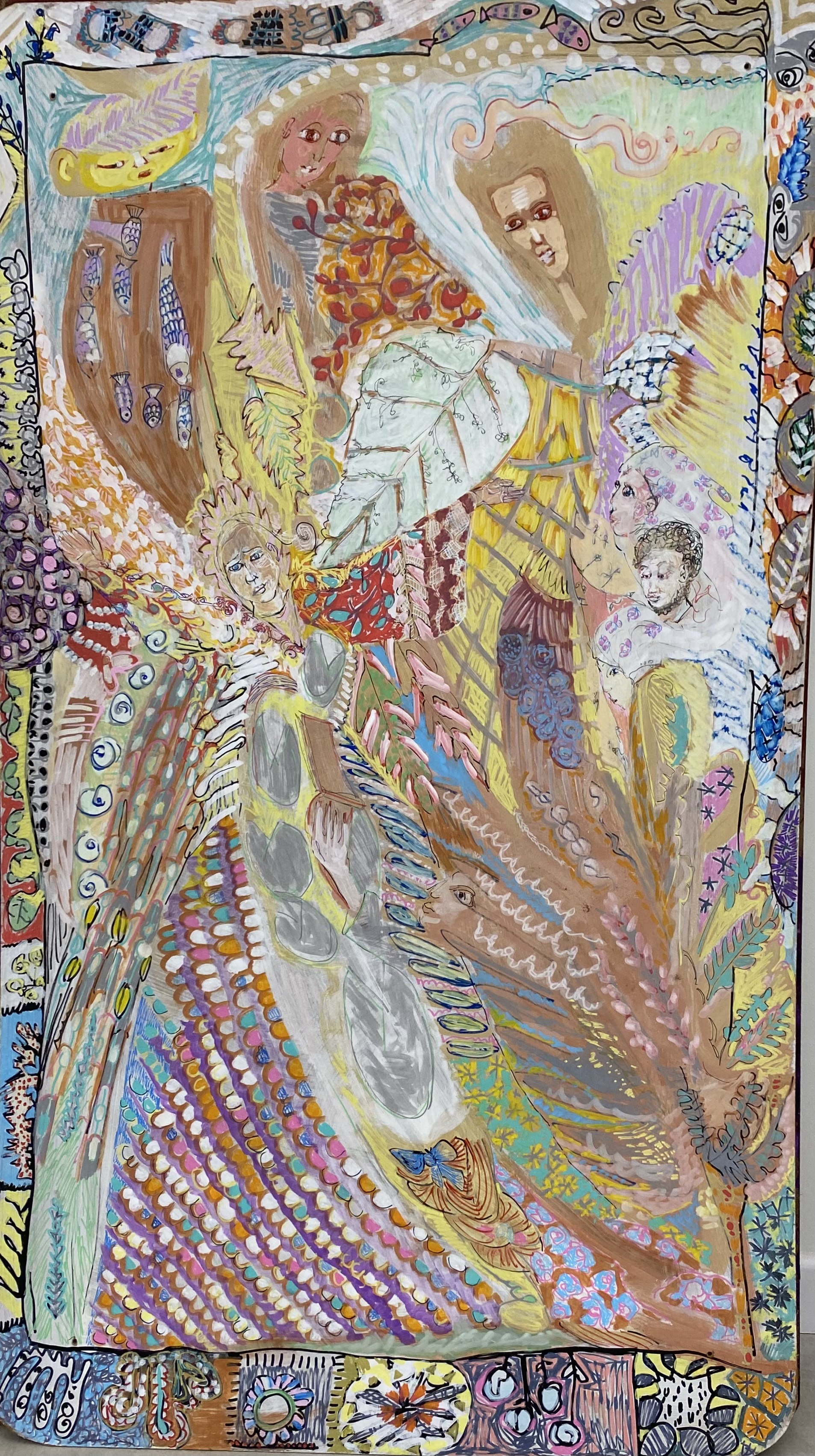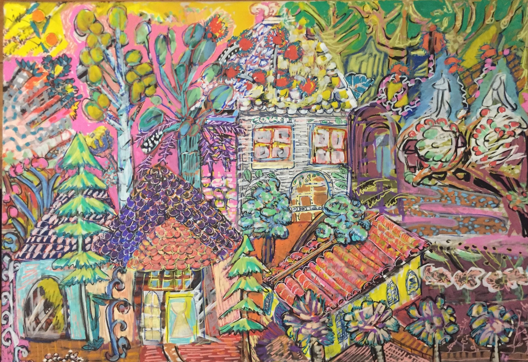 En peinture, elle privilégie l’huile mais utilise aussi Poscas, acrylique et pastels gras sur des supports variés.