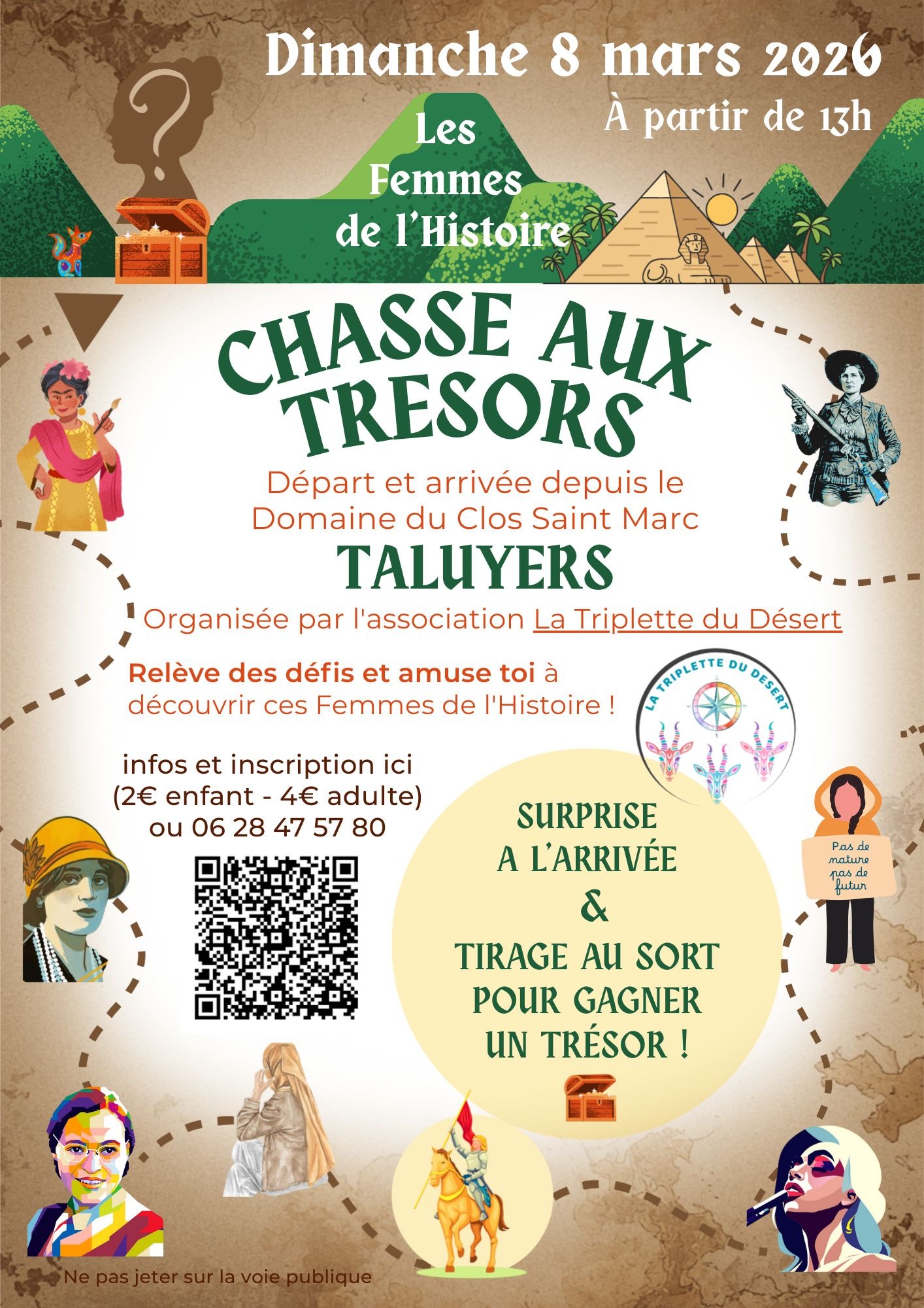 Inscriptions via : https://www.helloasso.com/associations/la-triplette-du-desert/evenements/chasse-aux-tresors-les-femmes-de-l-hisoire?