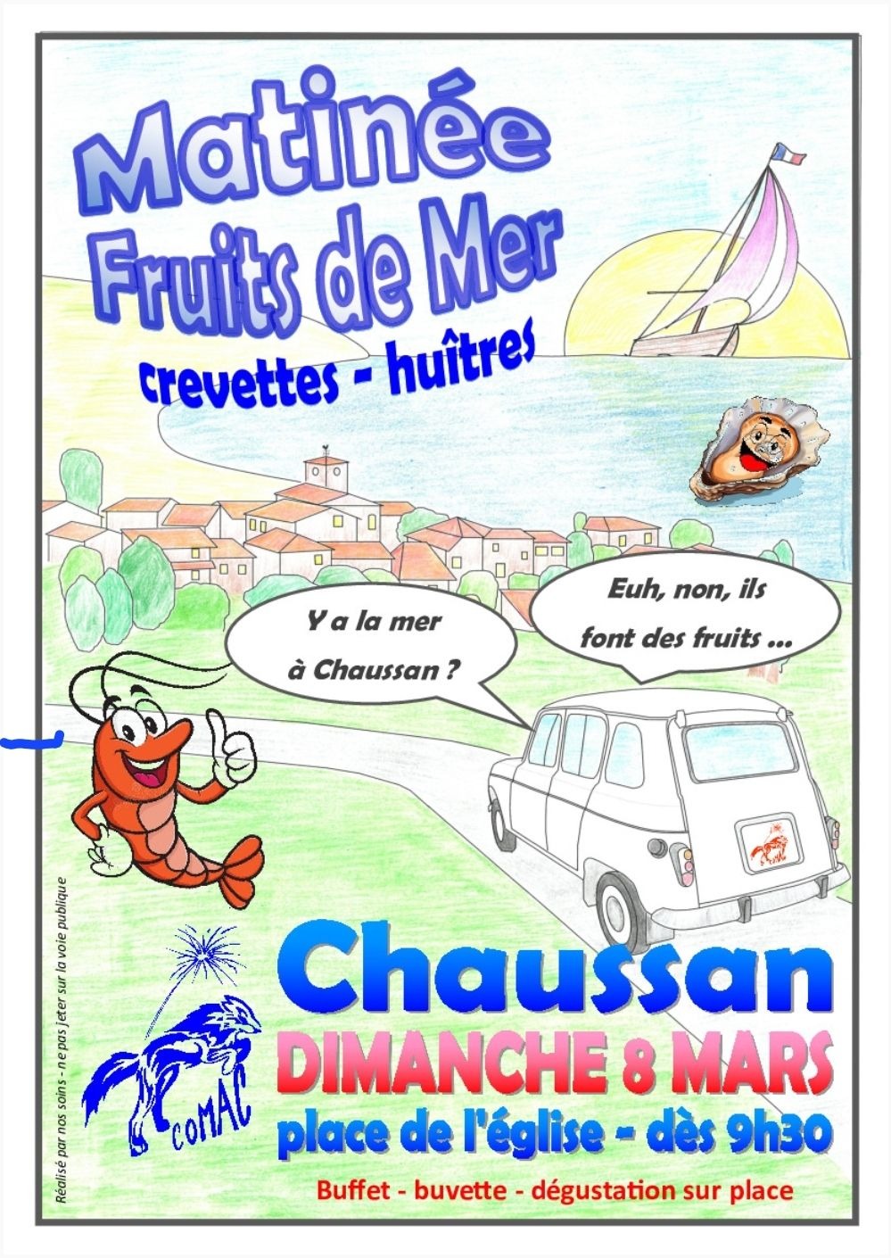 Matinée fruits de mer, crevettes, huîtres proposée par le COMAC de Chaussan. Buffet, buvette, dégustation sur place.