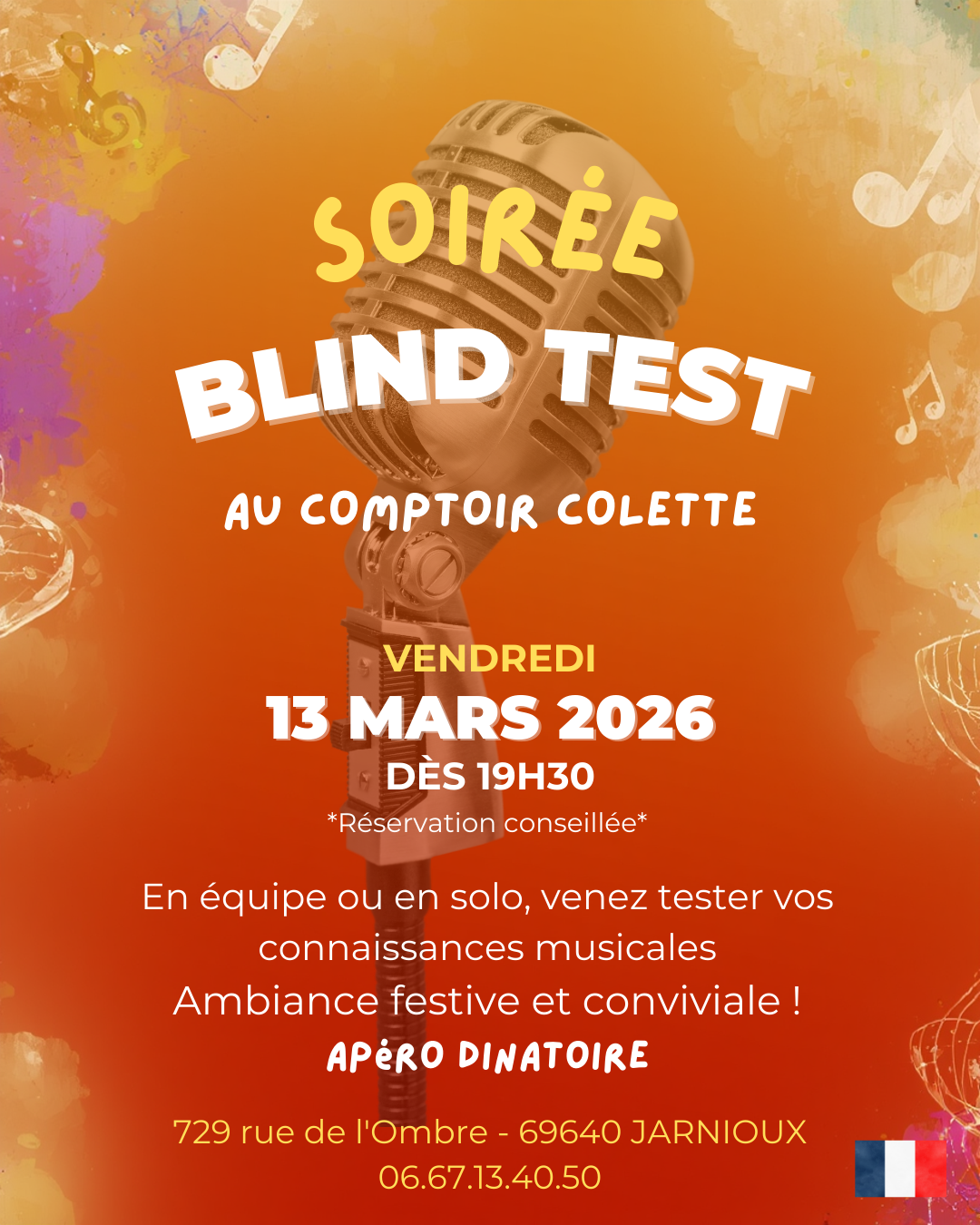 Le vendredi 13 mars 2026 à 19h30, on se retrouve au Comptoir Colette pour une soirée blind test pleine de rires, de musique et de bonne humeur