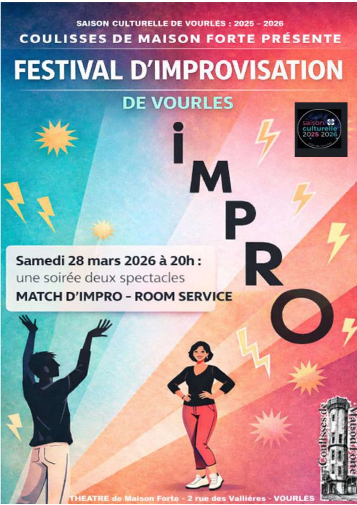Dans le cadre de la saison culturelle de Vourles, Coulisses de Maison Forte vous accueille à son festival d'improvisation, avec 2 temps forts : un stage d'improvisation et des spectacles d'improvisation.