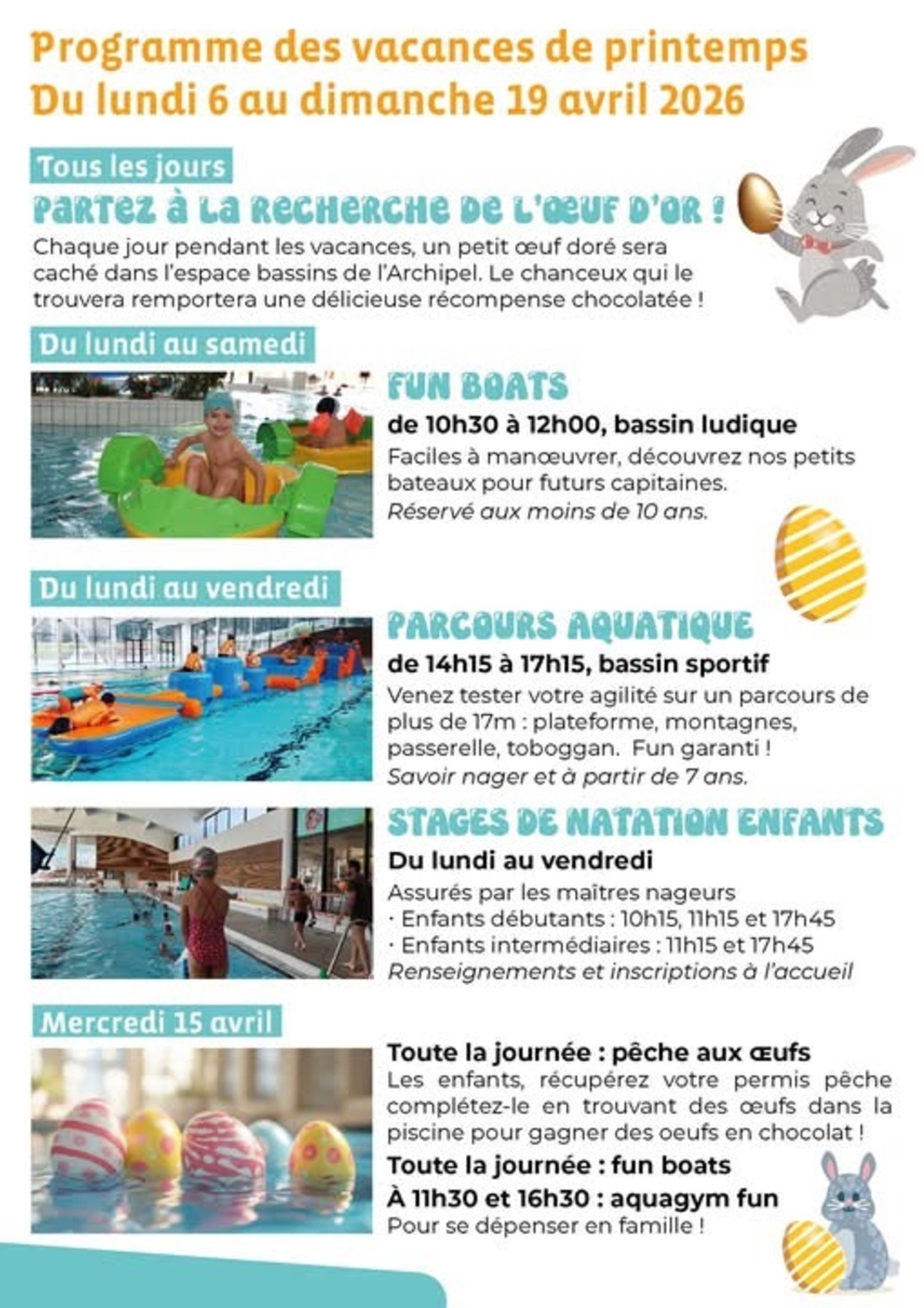 Le 15 avril : Récupérez votre permis pêche à l’accueil & complétez le en récupérant des œufs dans la piscine. Vous gagnerez des œufs en chocolat.