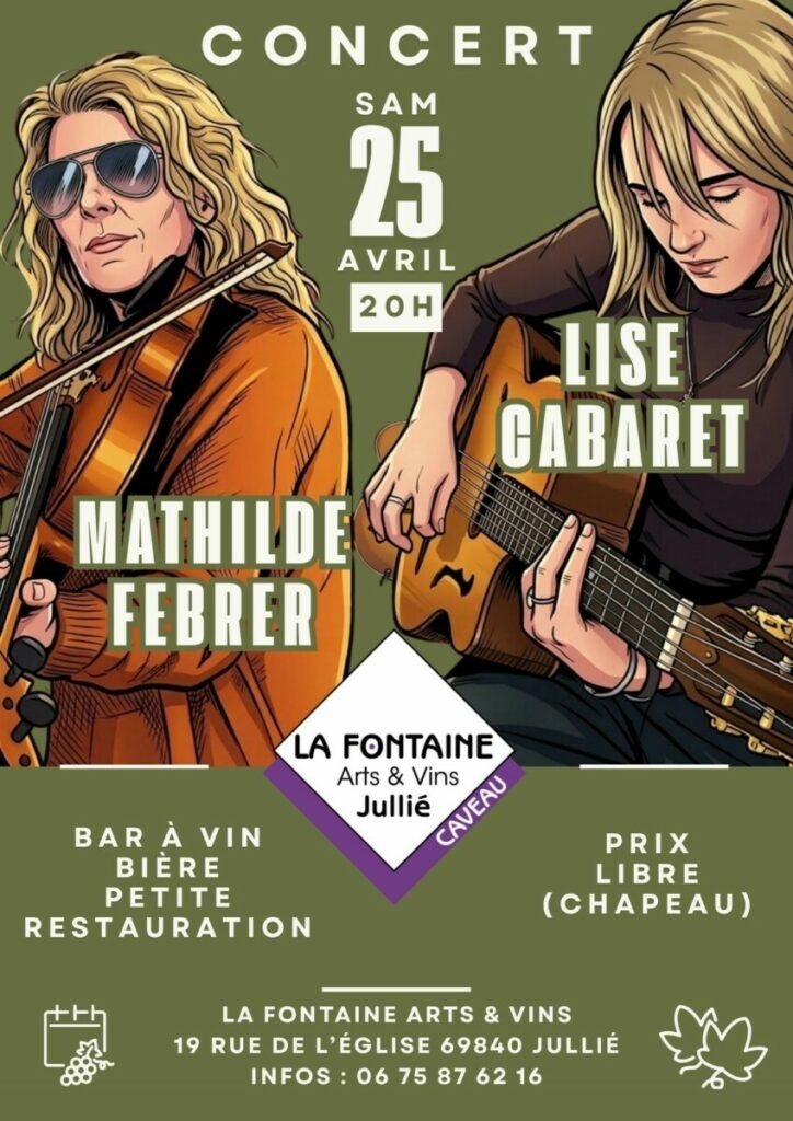 Rendez-vous le samedi 25 avril à 20h au caveau pour le concert de Lise Cabaret (guitare / chant), cette fois-ci en duo avec Mathilde Febrer (violon).