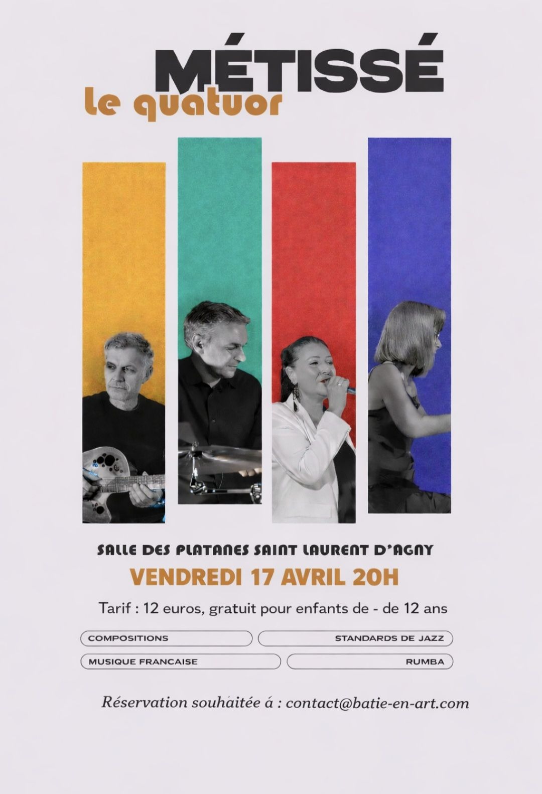 "Batie-en-art" vous invite à vibrer à des sons colorés du "quatuor Métissé" : Le groupe proposera un dialogue musical varié avec des standards de jazz et des compositions qui invitent au voyage : compositions, standards de jazz, rumba,...