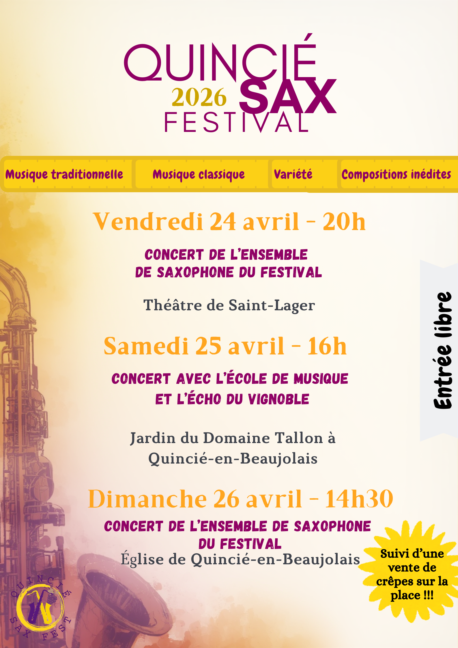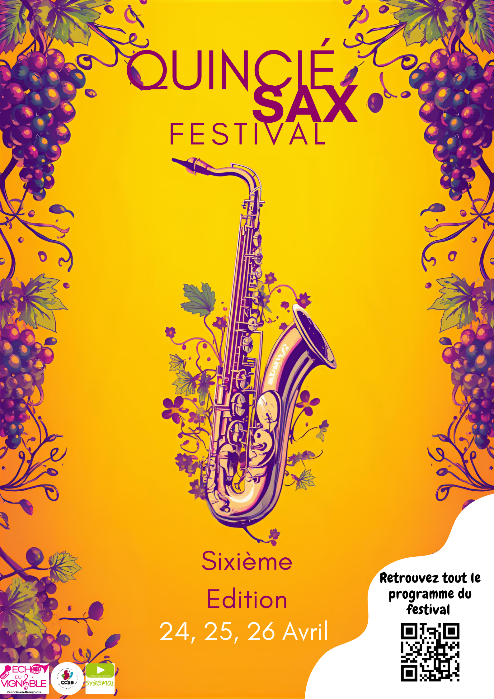Le Festival QuinciéSaxFest se déroulera du 24 au 26 avril 2026, au cœur du vignoble beaujolais.