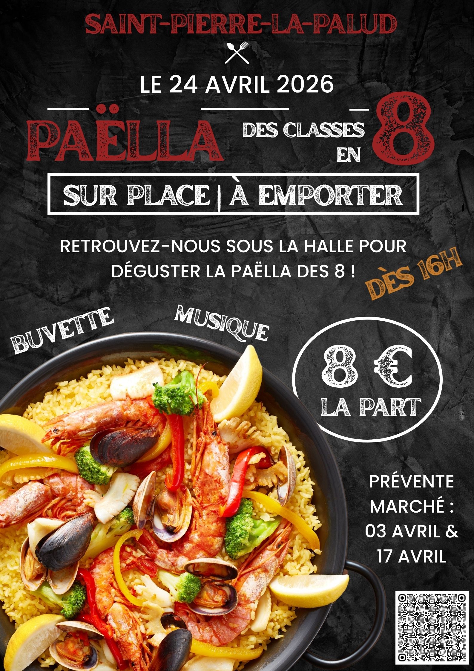 Tarif unique : 8 € (Part de paëlla 500 g).