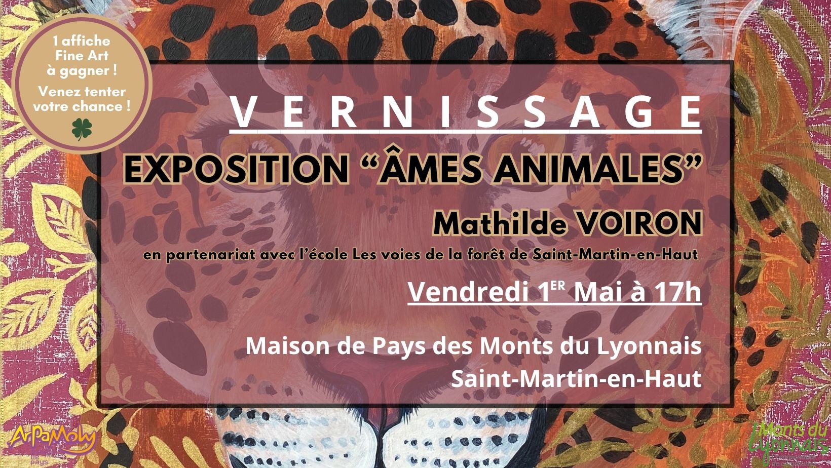 La peintre Mathilde VOIRON ainsi que les bénévoles de l'Association ARPAMOLY seraient très heureux de vous rencontrer à l'occasion du VERNISSAGE de l'EXPOSITION "Âmes animales" organisé, le Vendredi 1er Mai à 17h, à la Maison de Pays des Monts du Lyonnais