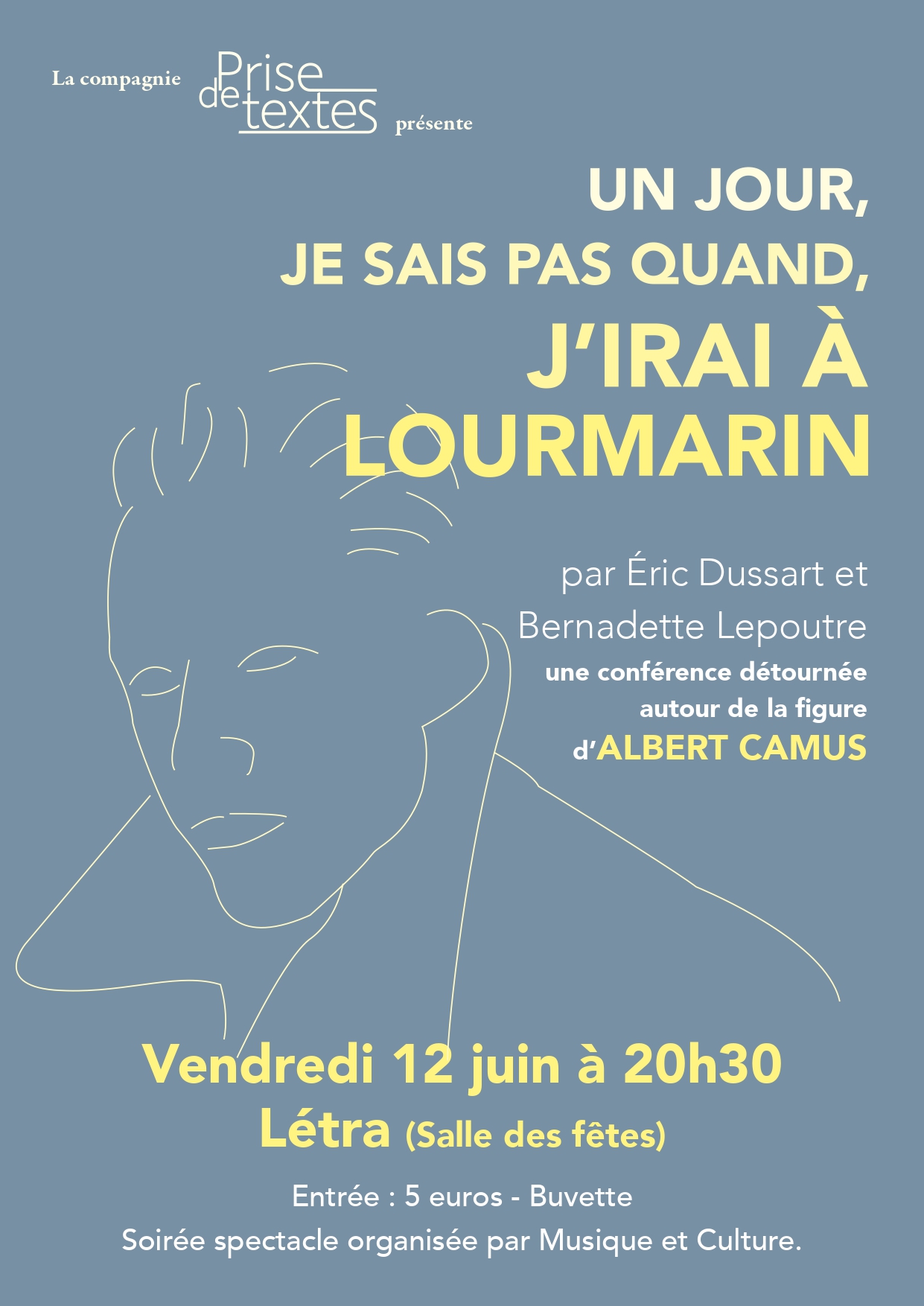 Conférence théâtralisée autour d'Albert Camus, présenté par Eric Dussart et Bernadet te Lepoutre. Soirée spectacle organisé par l'asociation Musique et Culture.