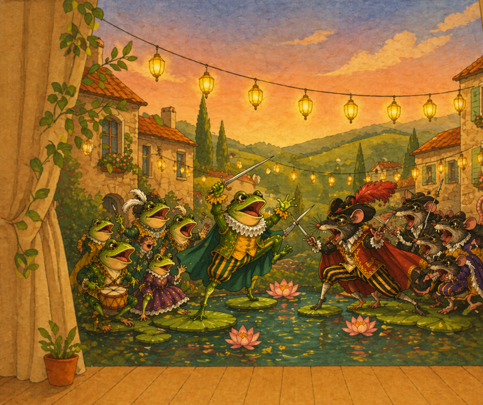 Laissez-vous surprendre par « Batraco », un conte théâtral franco-italien inspiré d’un poème du XVe siècle où rats et grenouilles s’affrontent autour d’une mare avec panache, mauvaise foi et un goût certain du drame. Une création vivante et drôle à découvrir à partir de 8 ans, suivie d’un échange avec la troupe du Gobbo.