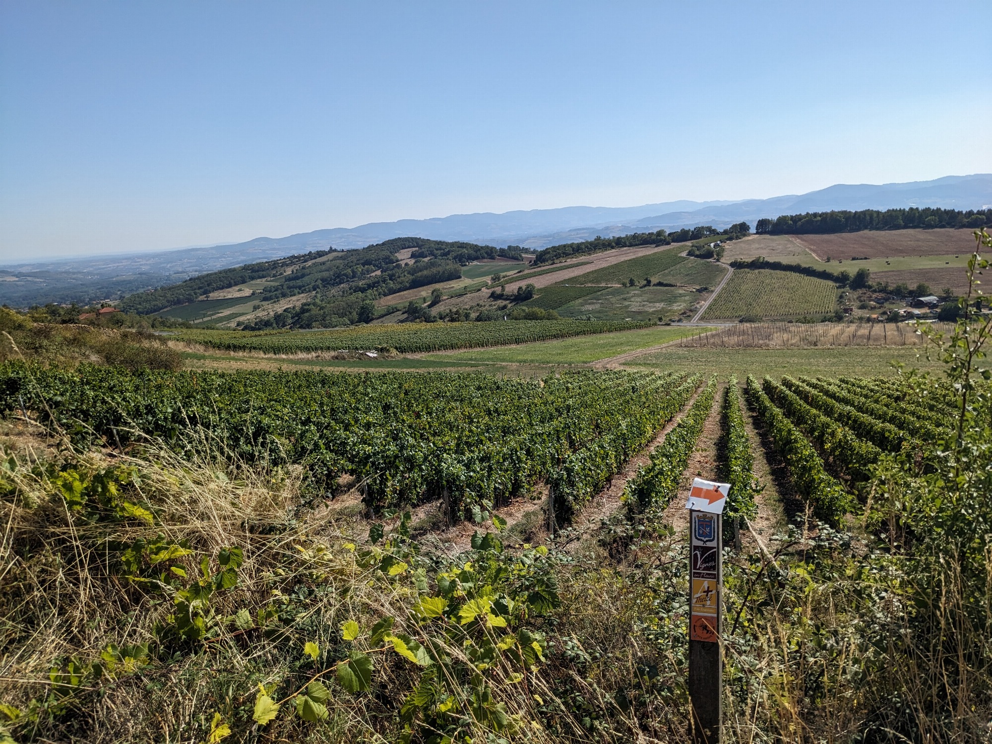 Balisage : Blason de Theizé et flèches oranges.