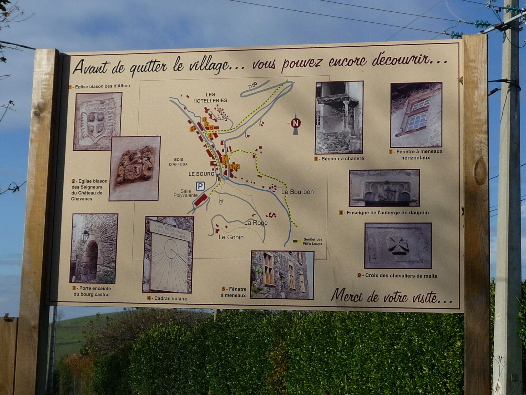 Dans le village 8 panneaux évoquent les vestiges du bourg castral, du prieuré-château, la chapelle St Joseph, les croix de chemins, la vigne. Au hameau des Hostelleries, on découvre le vieux pont, les anciennes auberges et le travail du maréchal-ferrant.