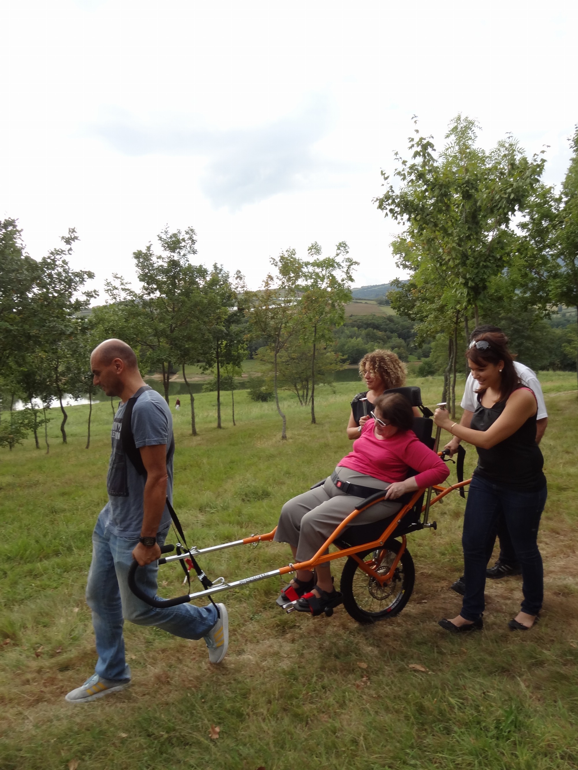 Avec la joëlette , promenez-vous partout ! La joëlette est un fauteuil tout terrain mono-roue qui permet la pratique de la randonnée à toute personne à mobilité réduite, enfant ou adulte avec l'aide de 4 accompagnateurs.