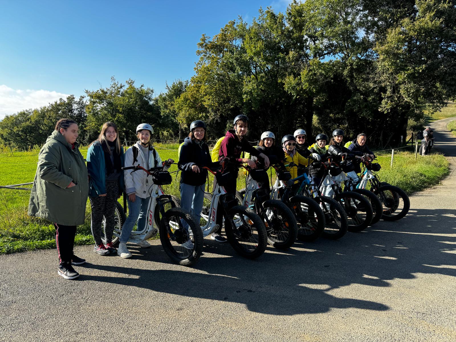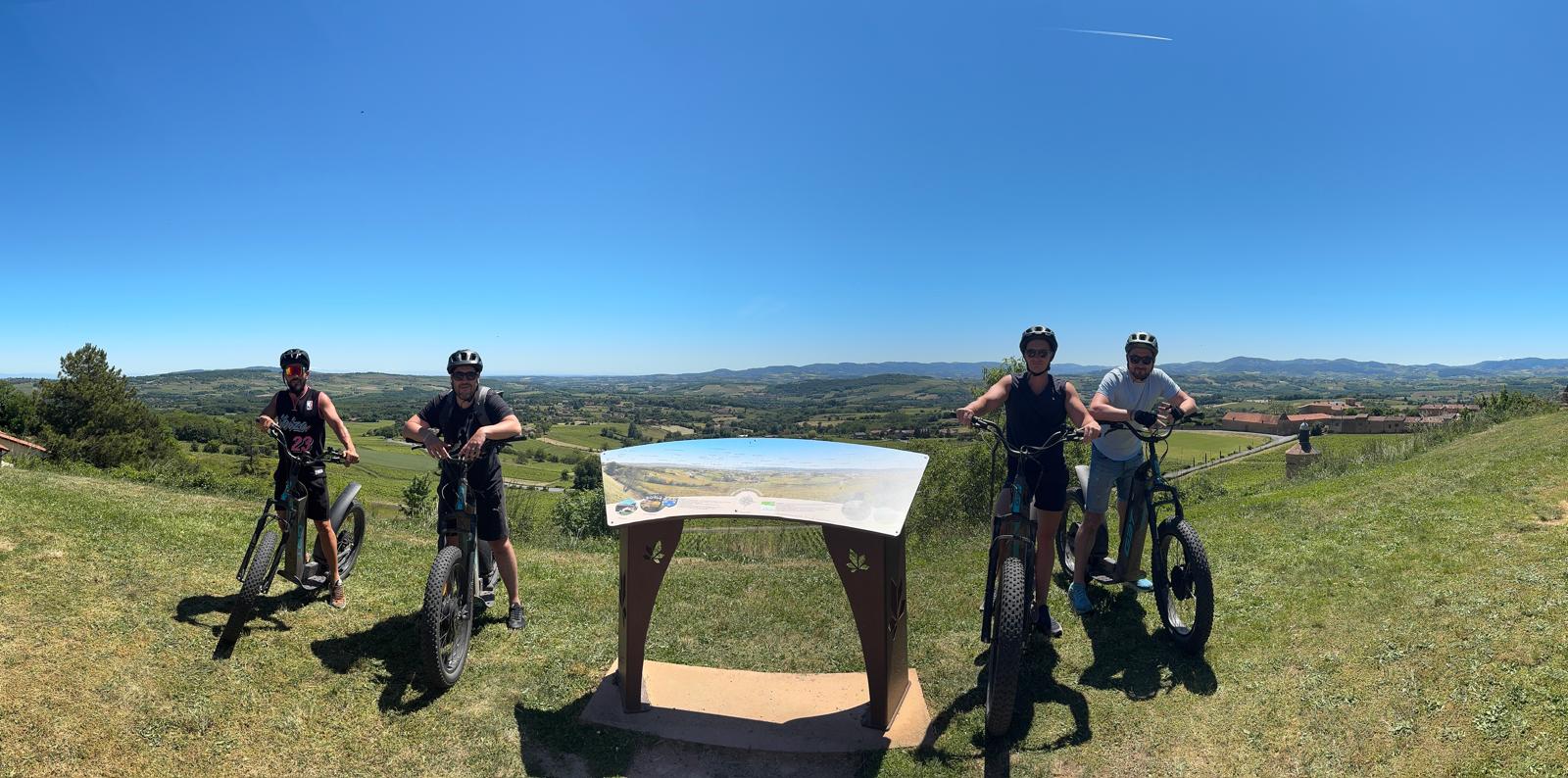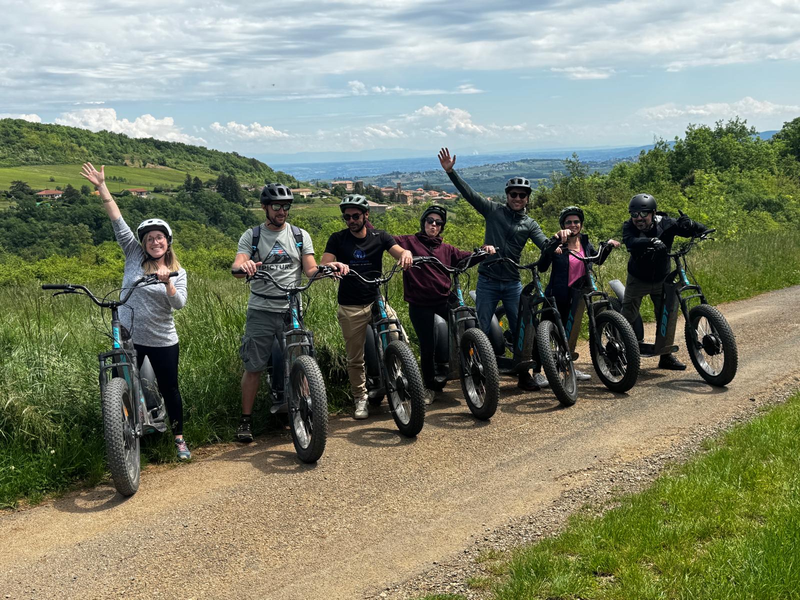 Balades guidées en trottinette électrique tout terrain au cœur des vignobles du Beaujolais, entre découverte de paysages d’exception, convivialité et authenticité locale.