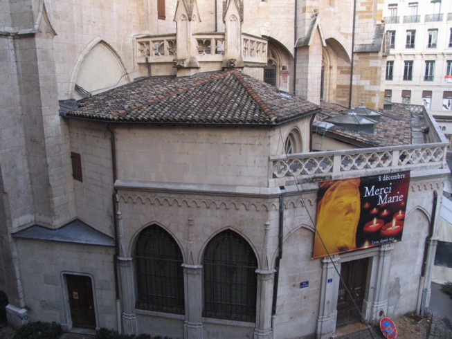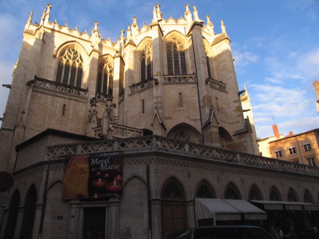 Construite en 177 à l'emplacement où se sont réunis les martyrs pour rompre le pain, elle prend en 579 le nom de Saint Nizier (l'évèque y est inhumé). Saccagée par les Sarrazins au IX° s, elle fut refaite du début du XIV° à 1454 de gothique flamboyant.