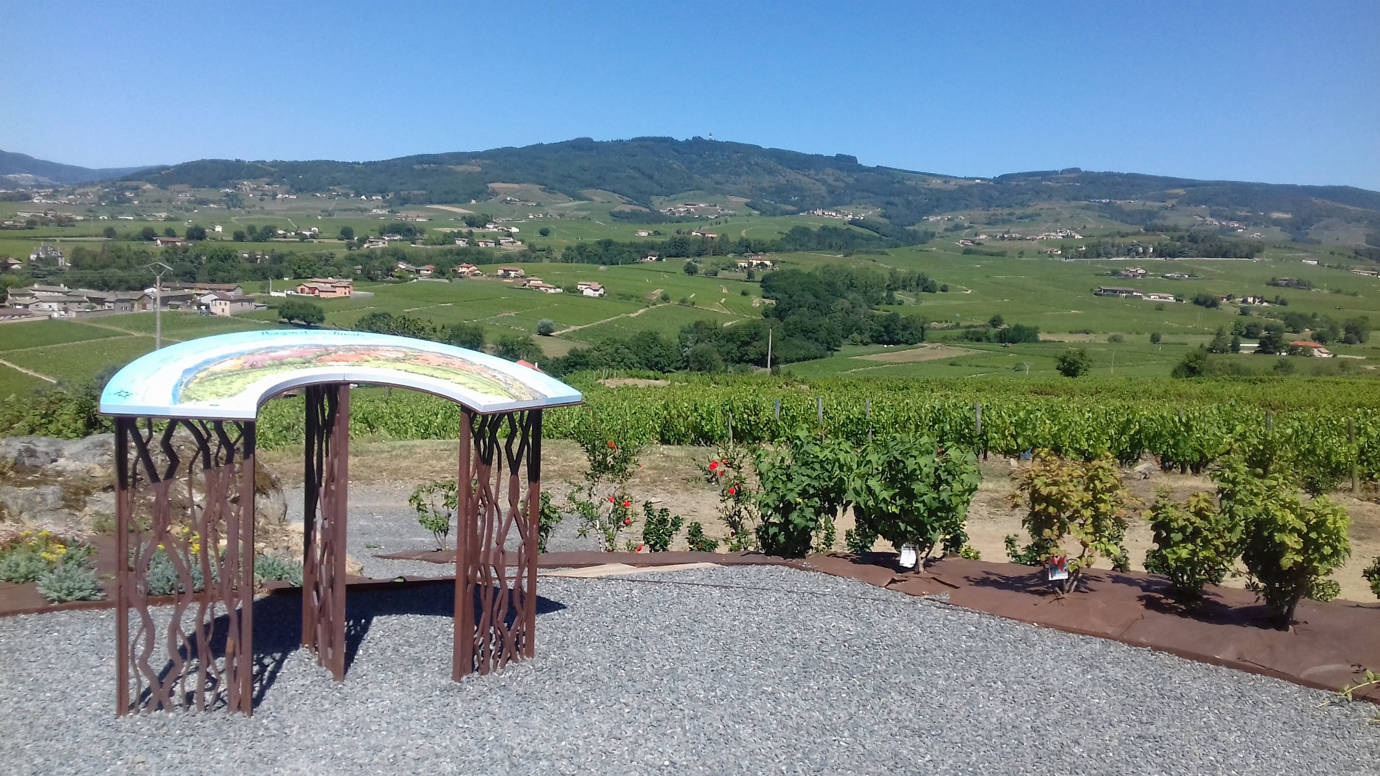 Au sommet, découvrez un paysage à 360° sur le vignoble, les monts du Beaujolais, la plaine de la Saône, les Alpes… deux tables d’orientation vous présentent les éléments de ce vaste panorama.