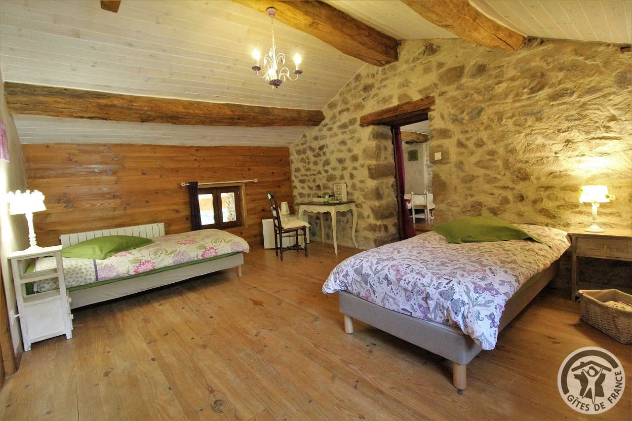 A l'étage de la maison, avec accès indépendant, 1 ensemble familial de 2 ch. (1 ch. 1 lit 2 pers., 2 lits 1 pers., lit bébé, poss. 1 lit supplémentaire, 1 ch. 1 lit 2 pers.). Dans un bâtiment annexe, 1 ch. familiale (1 ch. 1 lit 2 pers., 1 ch. 2 lits 1 pers.), sanitaires privés dans chacune. Ferme auberge sur place où vous prendrez vos petits déjeuners et vos tables d'hôtes. Vous dégusterez les produits de l'exploitation en agriculture biologique, ainsi que le vin. Sur place, animaux de la ferme, produits de la ferme.