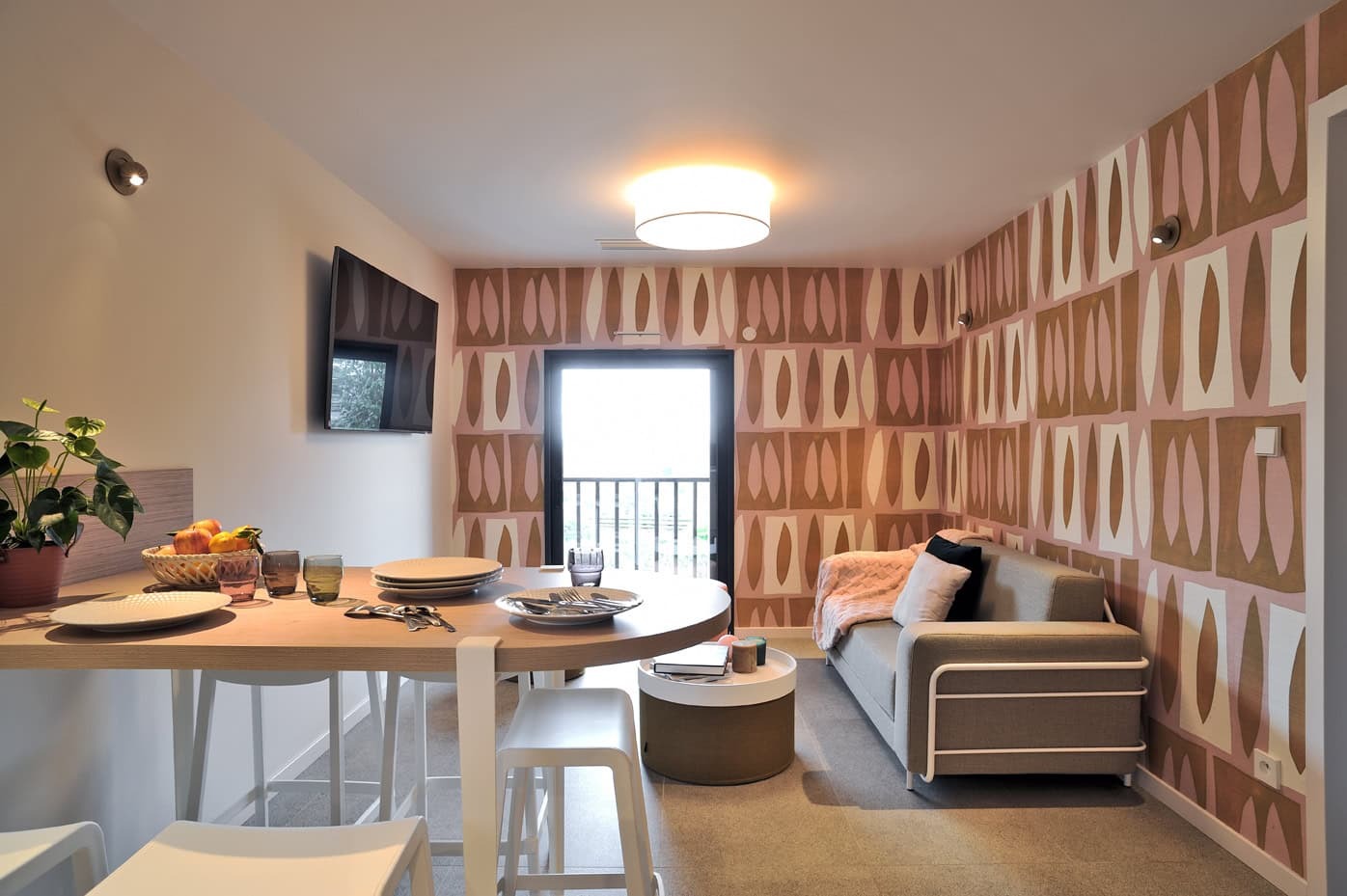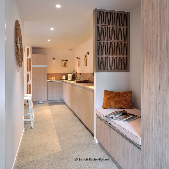 Depuis la chambre, vous accédez librement aux espaces communs : la cuisine et le salon.
