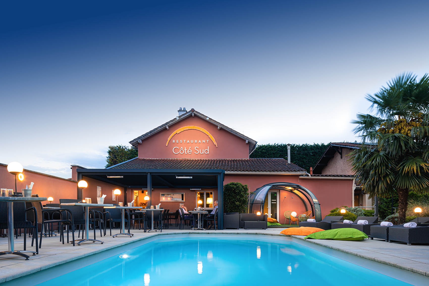Bienvenue à l'hôtel Les Pierres Dorées et son restaurant Côté Sud. Situé aux portes du Beaujolais à quelques minutes de Lyon, notre hôtel vous accueille dans un cadre reposant pour un séjour des plus agréables.(piscine, bar),