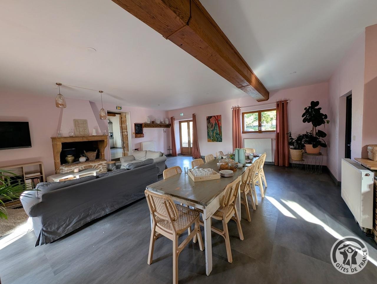 Gîte de groupe pour 15 personnes et 2 appartements pour une capacité de 30 couchages. Aménagé sur 2 niveaux. Au rez de chaussée 1 salon salle-à-manger de 50m² avec cuisine équipée, 1 salle de 80 m² pour réception, réunion, salle de jeux, 1 local traiteur, 2 toilettes.