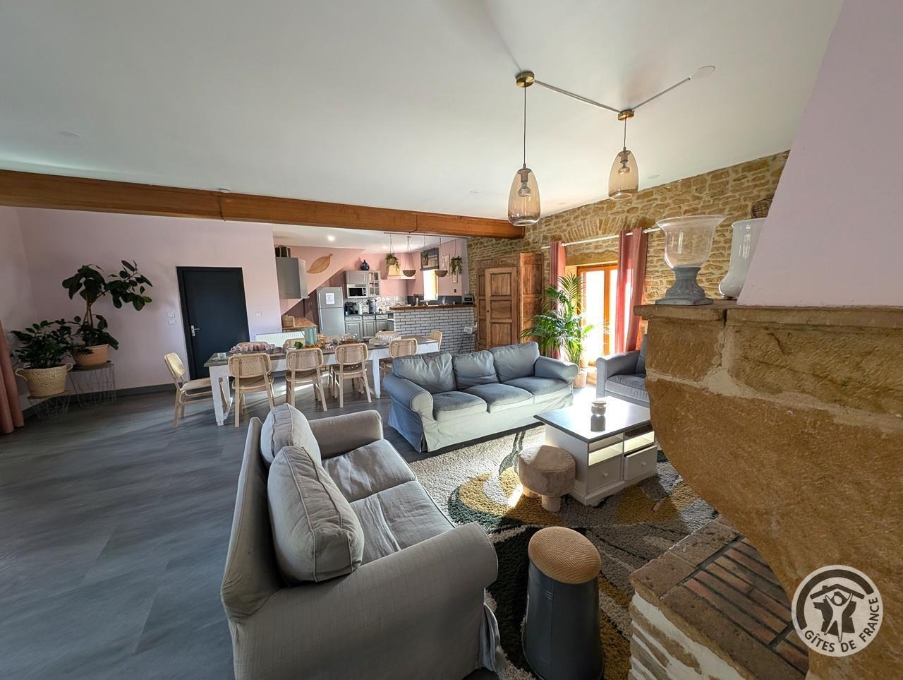 Maison de caractère au cœur du vignoble Beaujolais des Pierres Dorées. Gite de groupe pour 15 pers. avec piscine ext. avec sur place une salle de réception / réunion pour 60 pers. et 2 gîtes de 5 pers. chacun avec lits d'appoints. 30 couchages au total.